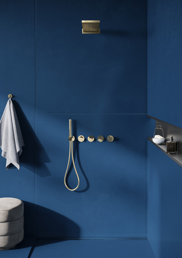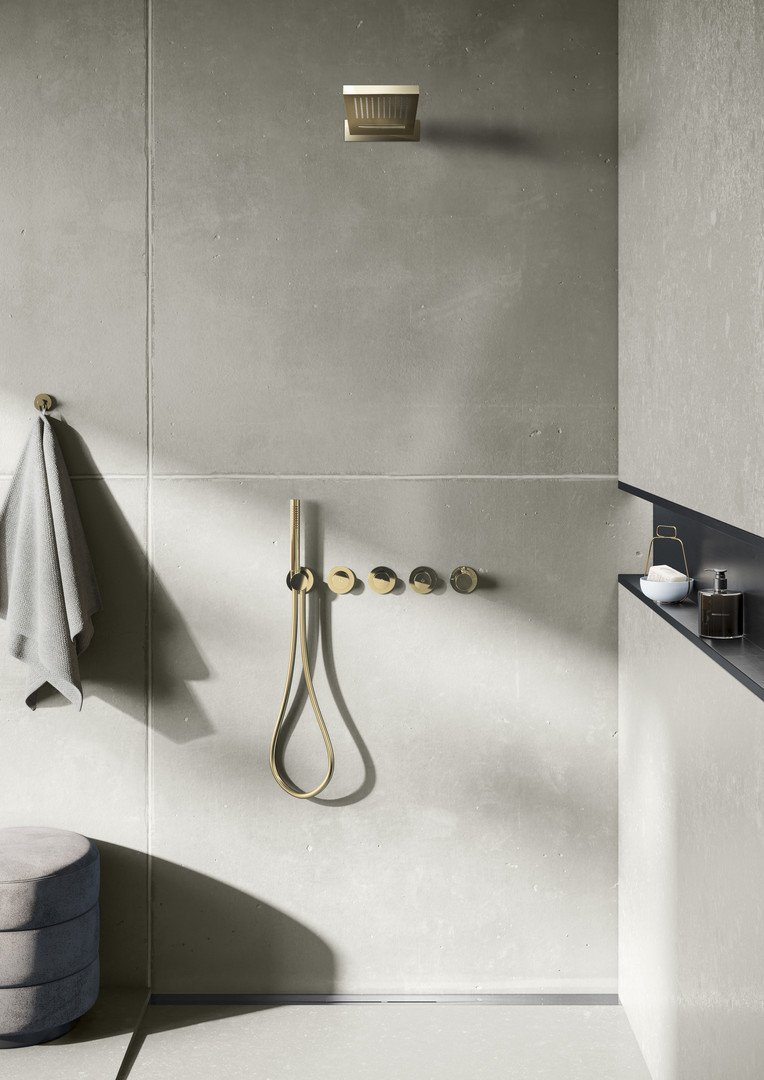 Herzbach Fertigmontageset MODUL7 PUSH Thermostat, mit Stabhandbrause, 3 Verbraucher, PVD Gold
