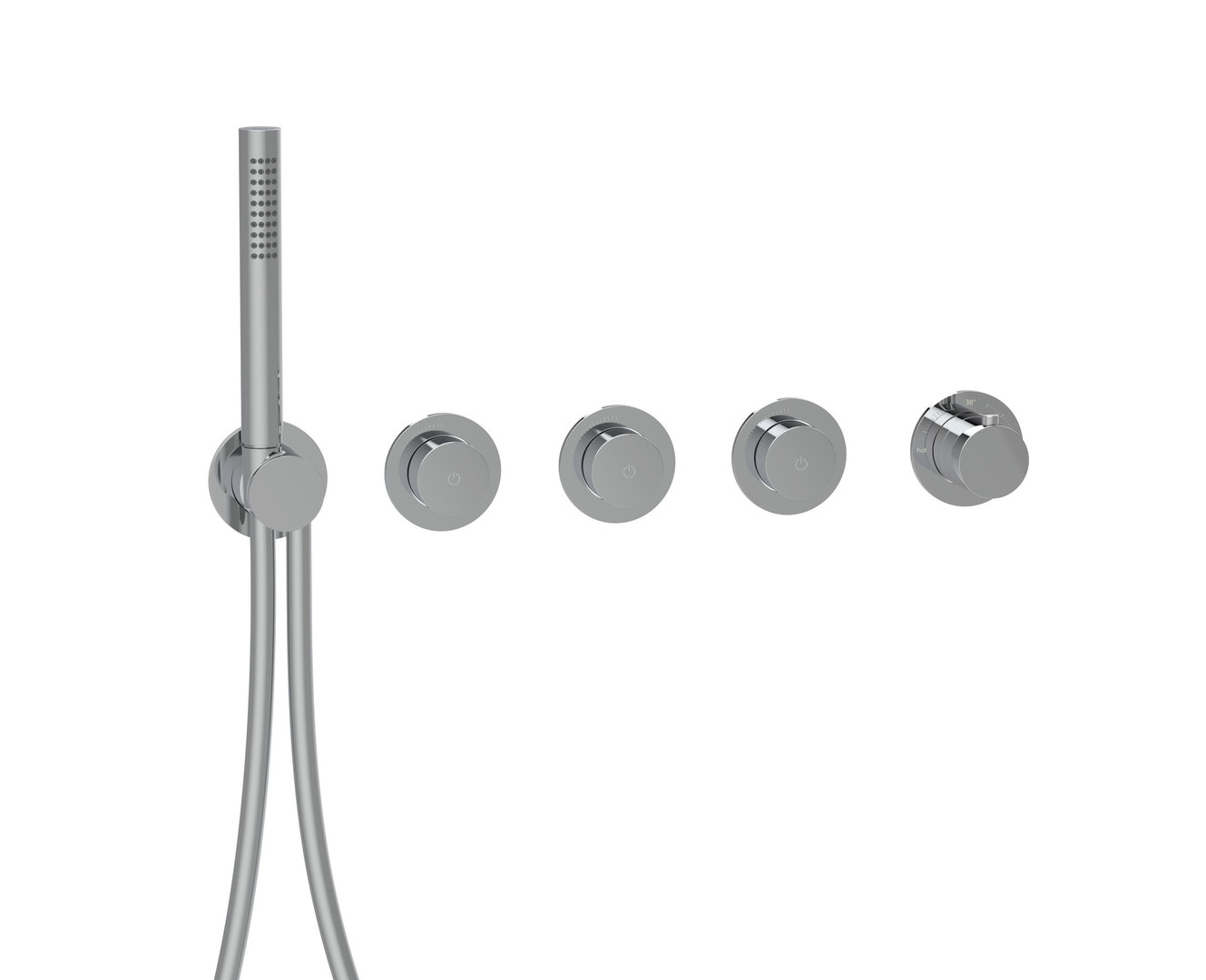 LOGIC-Thermostatkartusche, Heißwassersperre 38°C, Start + Stop des Wasserflusses durch drücken des PUSH Mengenventils, stufenlose Mengenregulierung, MODUL7 Brauseschlauch 150 cm mit Drehkonus, eigensicher gegen Rückfließen, bestehend aus Thermostat, 3x PUSH Mengenventil, Brausehalterset, Ausführung chrom/PVD Gold/schwarz matt mit Messing Stabhandbrause, Messing Bediengriffen und Messing Modulblenden Ø 70 mm, Ausführung Edelstahl mit Edelstahl Stabhandbrause, Edelstahl Bediengriffen und Edelstahl Modulblenden Ø 70 mm
