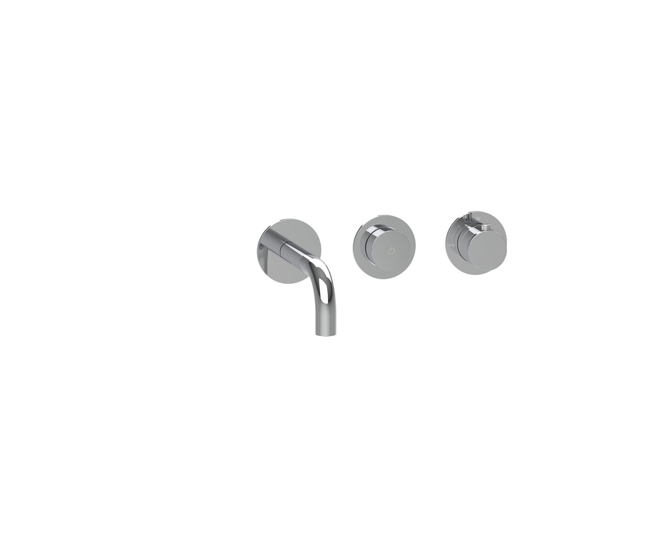 LOGIC-Thermostatkartusche, Heißwassersperre 38°C, Start + Stop des Wasserflusses durch drücken des PUSH Mengenventils, stufenlose Mengenregulierung, bestehend aus Thermostat, PUSH Mengenventil, Wandauslauf, Ausführung chrom/PVD Gold/schwarz matt mit Messing Bediengriffen und Messing Modulblenden Ø 70 mm, Ausführung Edelstahl mit Edelstahl Bediengriffen und Edelstahl Modulblenden Ø 70 mm