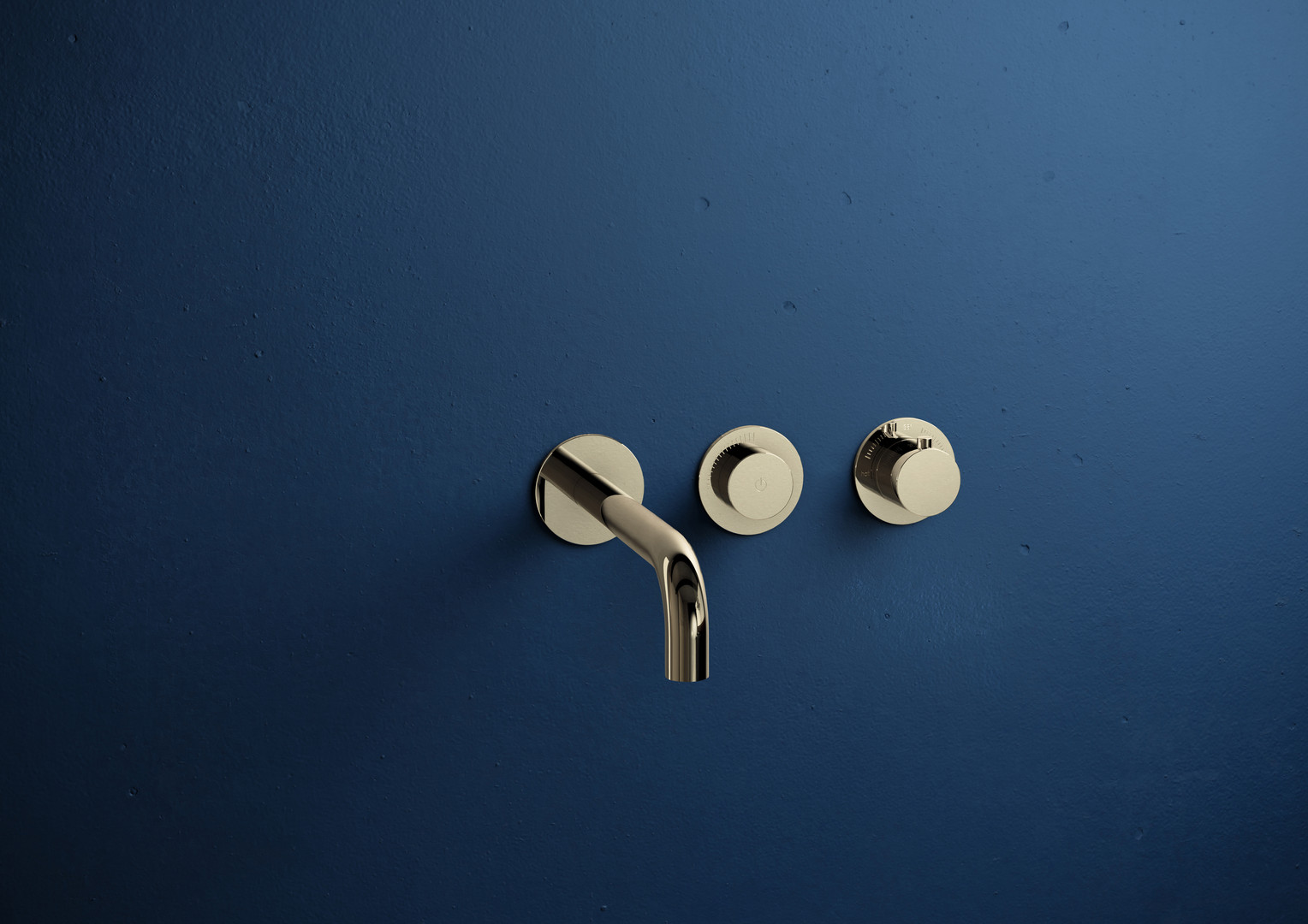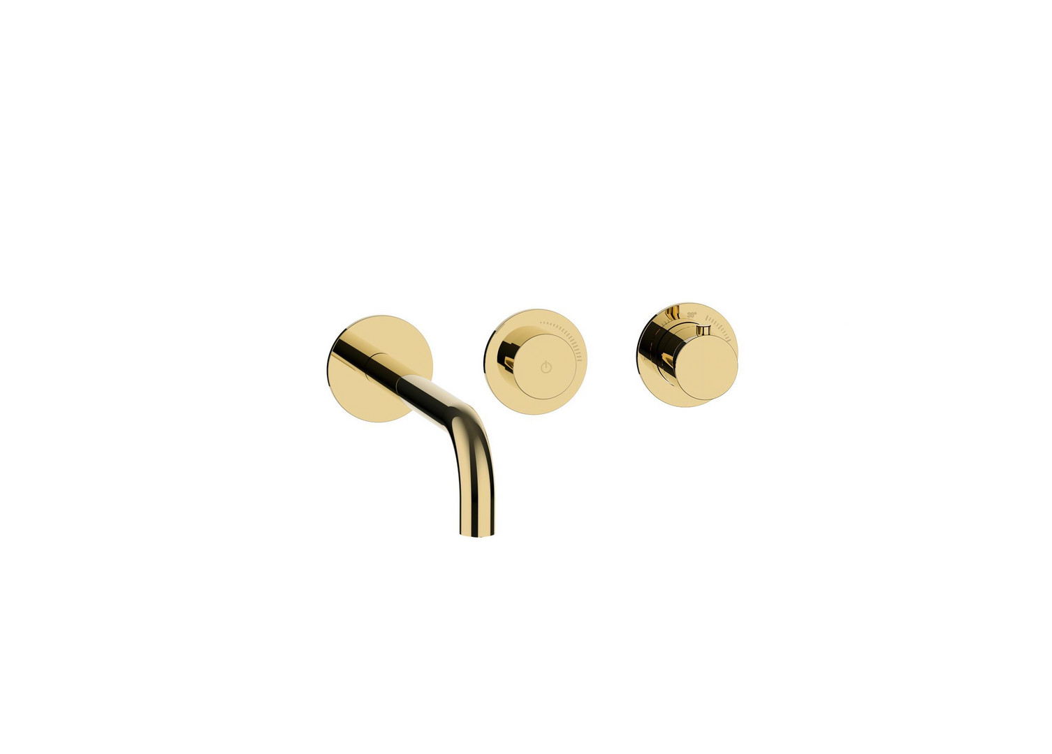 LOGIC-Thermostatkartusche, Heißwassersperre 38°C, Start + Stop des Wasserflusses durch drücken des PUSH Mengenventils, stufenlose Mengenregulierung, bestehend aus Thermostat, PUSH Mengenventil, Wandauslauf, Ausführung chrom/PVD Gold/schwarz matt mit Messing Bediengriffen und Messing Modulblenden Ø 70 mm, Ausführung Edelstahl mit Edelstahl Bediengriffen und Edelstahl Modulblenden Ø 70 mm