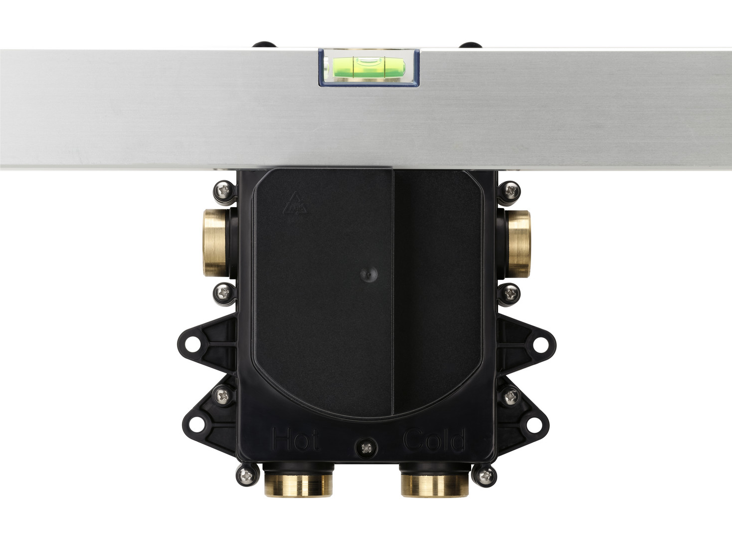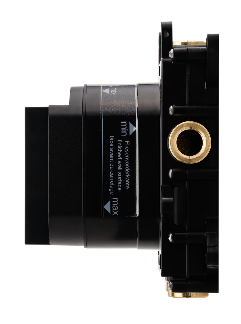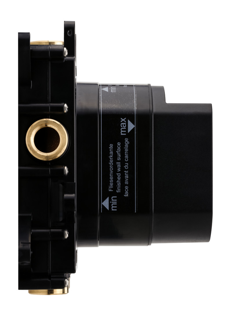 mit LOGIC Befestigungssystem, für alle Installationsvarianten, Spül- und Abdrückvorrichtung integriert, minimale Einbautiefe 60 mm, 3 Abgänge 1/2" rechts/links/oben, Zuläufe 1/2" unten verwechslungssicher markiert, mit Flies-Dichtmanschette und 2 Blindstopfen für nicht benötigte Abgänge, passend für Einhandmischer und Thermostate (außer LOGIC XL)