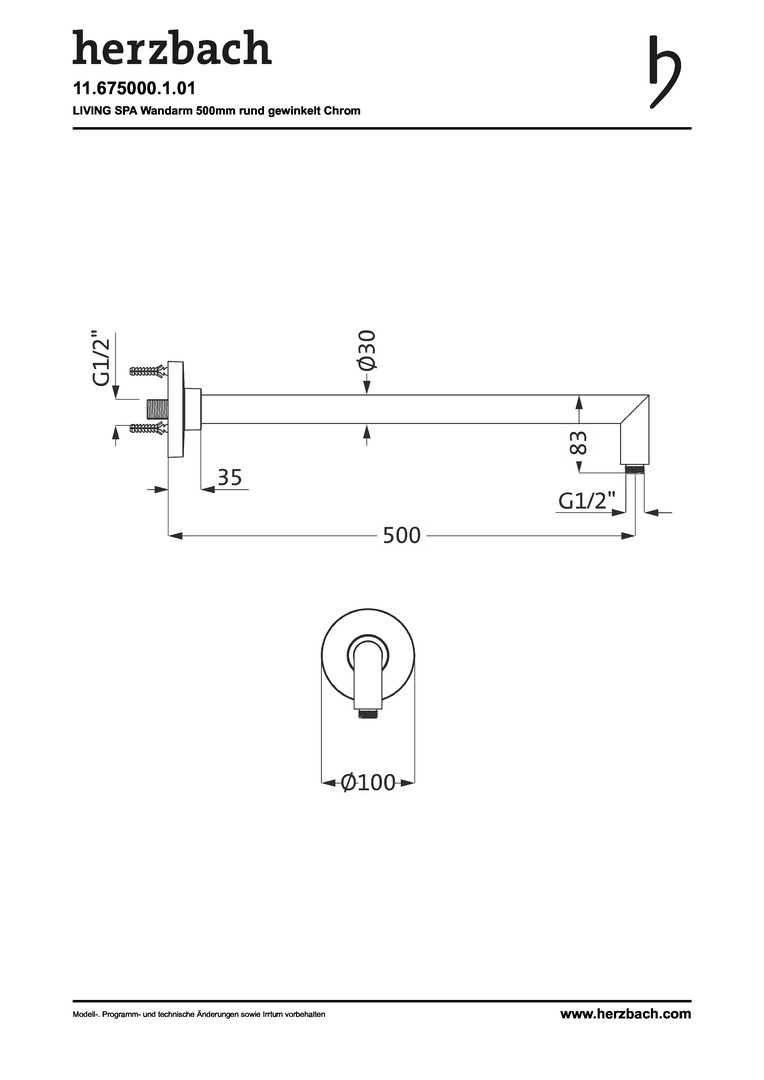 Herzbach Wandarm Living Spa round 500 mm mit Flanschbefestigung, für Regenbrause, 1/2" HF11675000101
