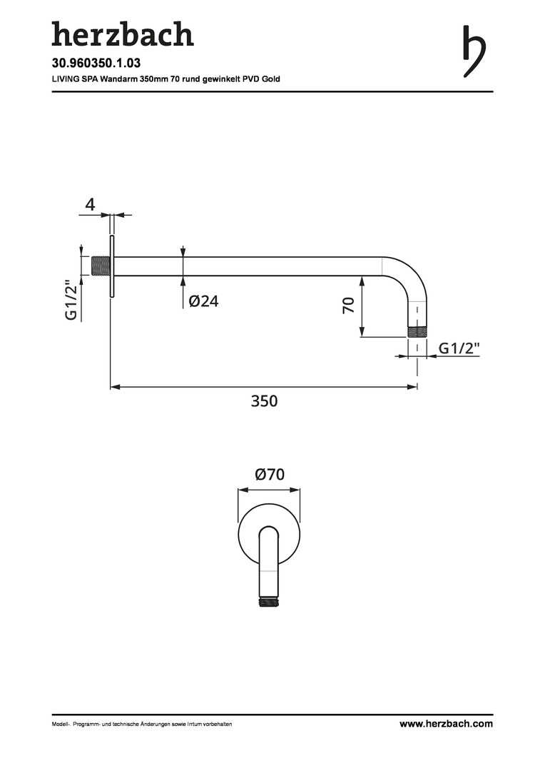Herzbach Wandarm Living Spa seven round 350 mm, PVD-gold, für Regenbrause, 1/2" HF30960350103