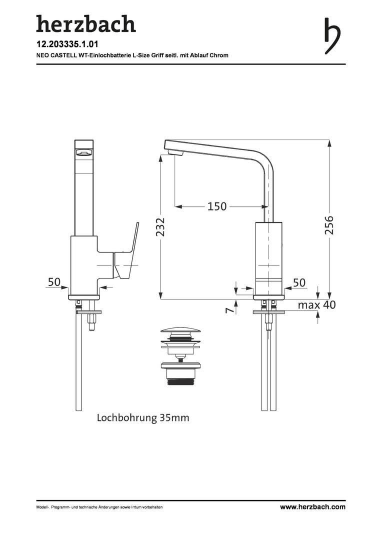 Herzbach Waschtisch-Einhebelmischer NeoCastell M-Size, schwenkbarer Auslauf und Universal-Push-Ablaufventil, chrom