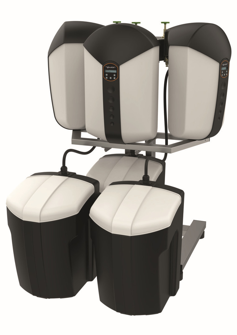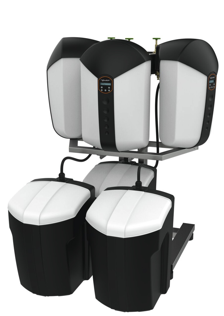 schützt mit weichem Wasser vor Kalkablagerungen und erhöht den Komfort, waagerechter oder senkrechter Einbau durch Drehen des QUICKSET-E Einbau-Drehflansch möglich, für Trinkwasser bis 30 °C, Betriebsdruck 2-7 bar, Anlage bestehend aus einem Bodengestell mit Parallelanschlussblock aus Messing mit Umgehungsventilen zur Aufnahme von 3 Enthärtermodulen, Enthärtermodule bestehend aus glasfaserverstärkte Behälter (PN 10) gefüllt mit Ionenaustauscherharz in Lebensmittelqualität zur optimalen Wasserverteilung und Minimierung von Druckverlust und Regeneriermittelaufwand, separater Salzlöse- und Vorratsbehälter mit kontinuierlicher Solebevorratung und integrierter Niveauüberwachung, Anbindung mit Lanzentechnik, verschleißfreie Keramikscheiben-Technologie für lebenslang programmierte Betriebsabläufe, Zwangsregeneration nach spätestens 96 Stunden und Anlagenhygienisierung durch eingebaute Desinfektionseinrichtung mit platinierten Titanelektroden, Steuerungselektronik mit Folientastatur und mehrzeiliger LCD-Anzeige für Betrieb, Regeneration, Salzmangel, farbiger Status-Leuchtanzeige, sowie manueller Regenerationsauslösung und potenzialfreier Störmeldung, einschließlich Einbau-Drehflansch mit Bajonettanschluss, mit Verschraubungen und Montagedeckel, mit Siphon zum normgerechten Anschluss an das Abwassersystem gemäß DIN EN 1717 und DIN 1988-100 sowie ein Härtemessbesteck, Spannungsversorgung 230 V/50 Hz