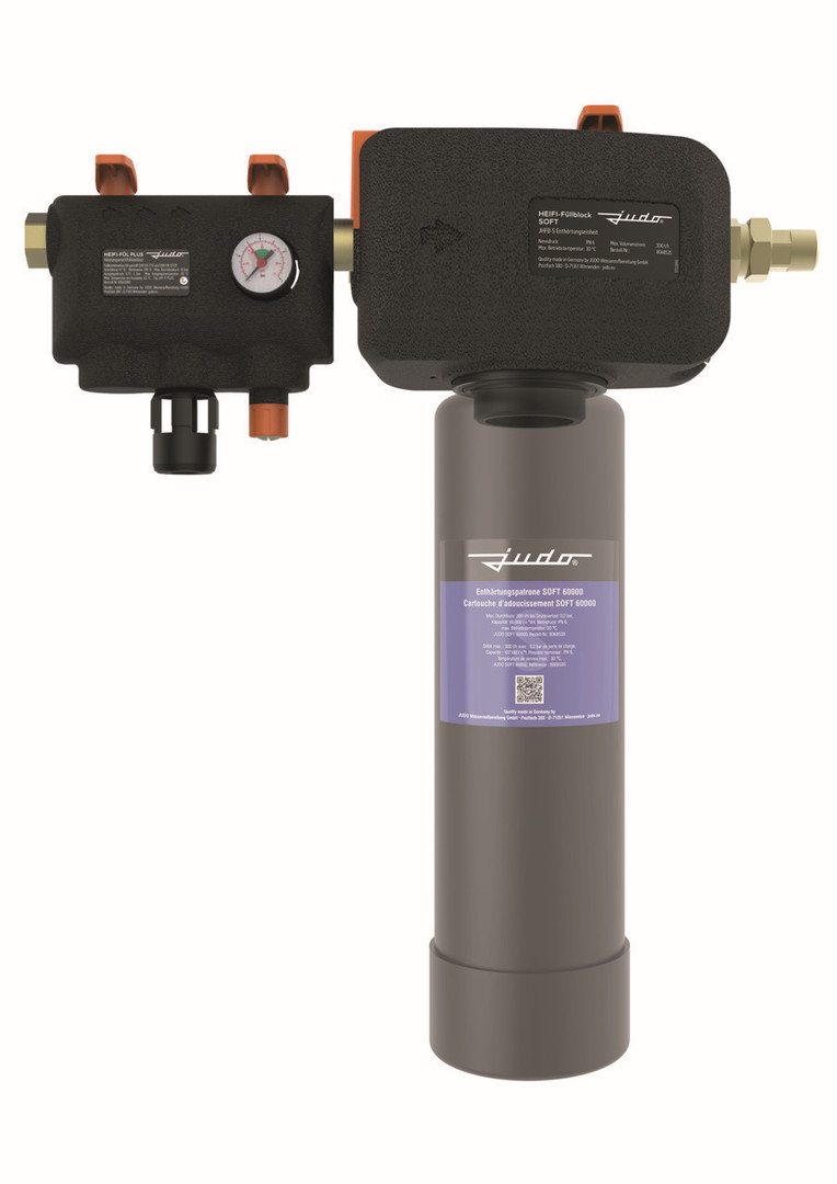 für Wasser bis 30 °C, Betriebsdruck max. 6 bar, variables System zum Befüllen und Nachspeisen der Heizungsanlage mit enthärtetem Wasser, nach ÖNORM EN 1717 und ÖNORM H 5195-1, bestehend aus einer HEIFI-FÜL PLUS Füllarmatur mit integriertem Feinfilter, Filtergewebe aus Edelstahl 25 µm, sowie einem HEIFI-Füllblock SOFT zur Enthärtung des Füll- und Ergänzungswassers mit integrierter Überwachung der Kapazitäten von SOFT Enthärtungspatronen
