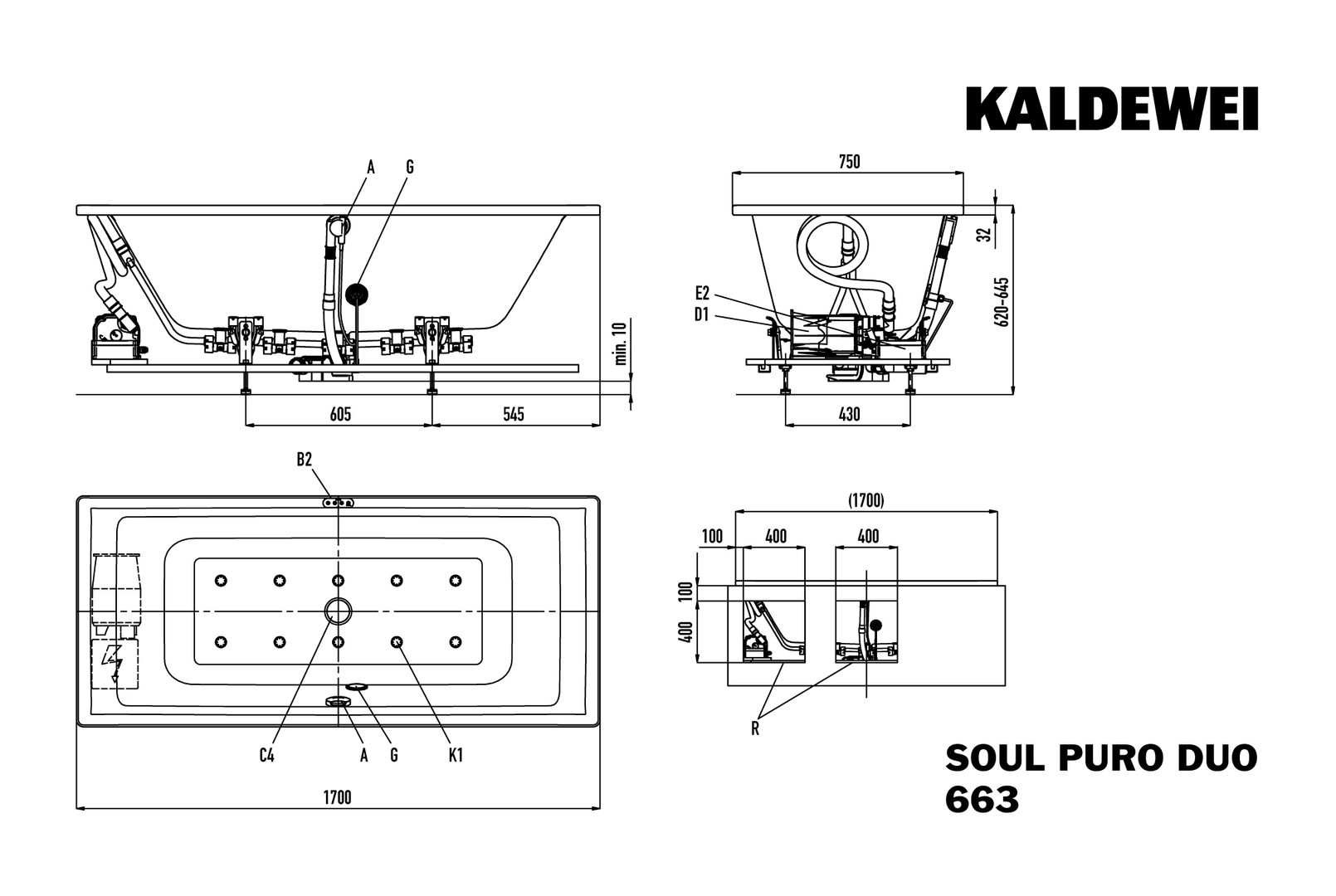KALDEWEI PURO DUO, Mod.663 SOUL 1700x750mm, alpinweiß, Perl-Effekt, rechts, integrierter Einlauf, Sichtteile alpinweiß