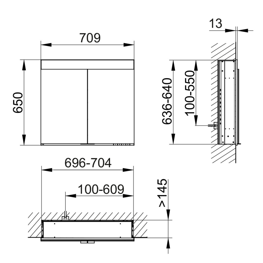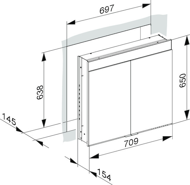 Tiefe vor der Wand 24 mm, Drehtüren aus Kristall-Doppelspiegeln mit Anschlagsdämpfung, Korpus: Aluminium (silber-gebeizt-eloxiert), Rückwand: verspiegelt, Schutzart: IP24, Bedienung: Bedienfeld mit kapazitiver Touch-Sensorik, Funktionen: ein-/ausschalten, stufenlos dimmen, integrierte Nebenstellenfunktion (Raumschalter), Beleuchtung: stufenlos einstellbar von 2700 Kelvin (warmweiß) bis 6500 Kelvin (Tageslicht), LED, Innenraumausleuchtung, Spiegelheizung optional (mittig der Türen platziert, optische Anzeige der Aufheizphase, automatische Abschaltung nach 20 Minuten, 56 Watt), Ausstattung: 2x innenliegende Steckdose, 3x höhenverstellbare Glasablage (710 mm Breite), 2 x 3 höhenverstellbare Glasablagen (1060 mm Breite), 1x Aufbewahrungsfach mit verschiebbarem Glasdeckel (710 mm Breite), 2x Aufbewahrungsfach mit verschiebbarem Glasdeckel (1060 mm Breite), Innenraumausleuchtung