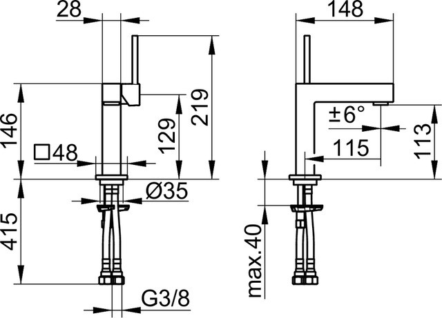 Auslaufhöhe 113 mm, Einlochmontage mit Schnell-Montage-System, Anschlussart: Anschlussschläuche G 3/8, Mischwasserkartusche mit keramischen Dichtscheiben, Luftsprudler M 24x1, Strahlwinkel +/- 6° verstellbar, Durchflussmenge begrenzt auf 7,6 l/min, für Durchlauferhitzer geeignet, geräuschgeprüft