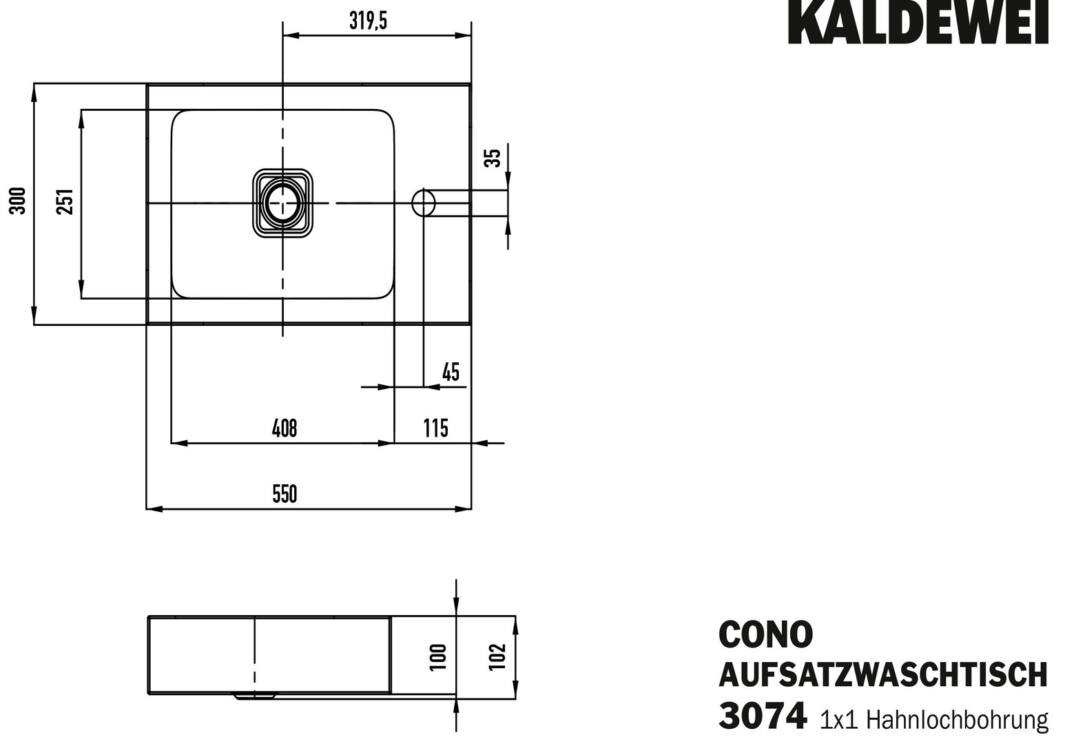 Kaldewei Aufsatz-Waschtisch CONO 3074 55x30cm, 1 Hahnloch, chrom, Perl-Effekt, manhattan KA908106013199