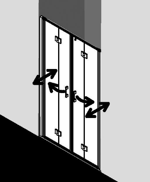zum Einbau in einer Nische, teilgerahmt, mit vier Glasflügeln-im Wandgelenkprofil 90° nach innen und außen schwenkbar, im Beschlagsgelenk 180° nach außen schwenkbar, mit Zugstab, ohne Zugstab installierbar, Glasstärke 5 mm, Profile aus Aluminium, Griffe und Gelenke aus Metall, Verstellmöglichkeit je Wandprofil 25 mm, Profilgelenk und Beschlagsgelenk mit Hebe-Senk-Mechanismus, durchgehende Magnetleisten und Dichtprofile, waagerechte Dichtleiste in Dachrinnenform, mit 6 mm Bodenschwelle oder ohne Bodenschwelle (bodenfrei) installierbar, mit Befestigungsmaterial und transparentem Handtuchhalter-Haken, die waagerechte Schräge darf max. 5 mm betragen