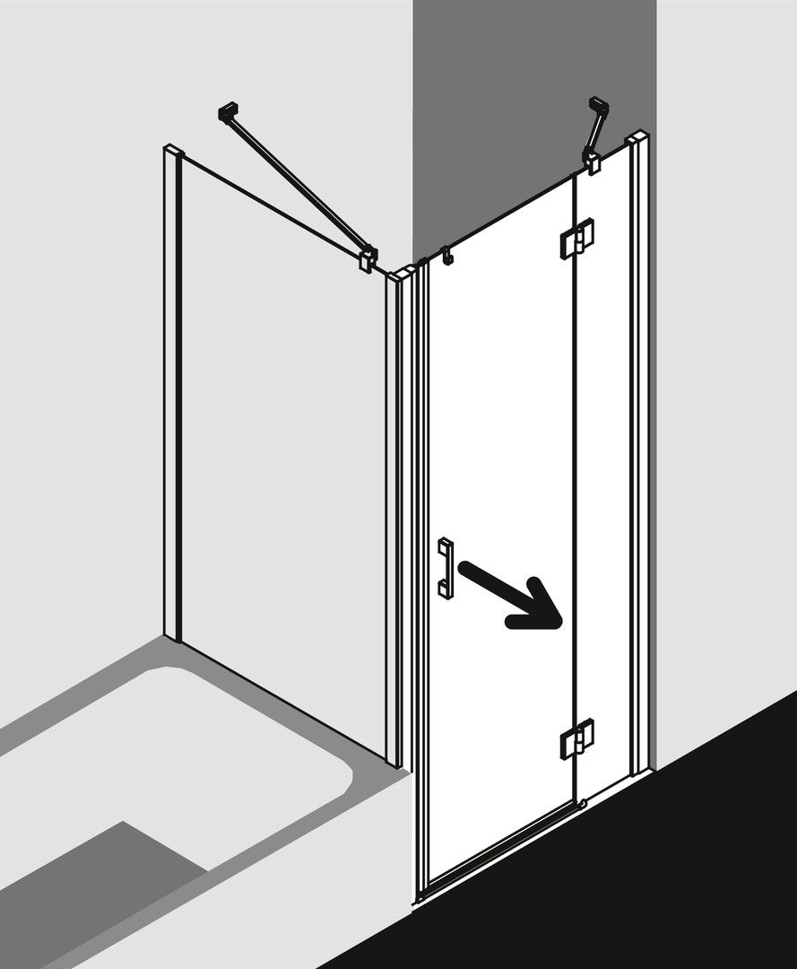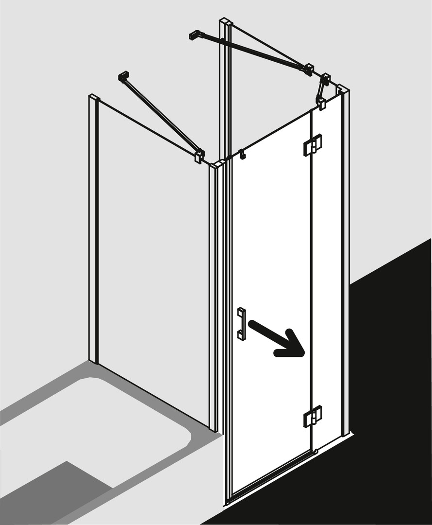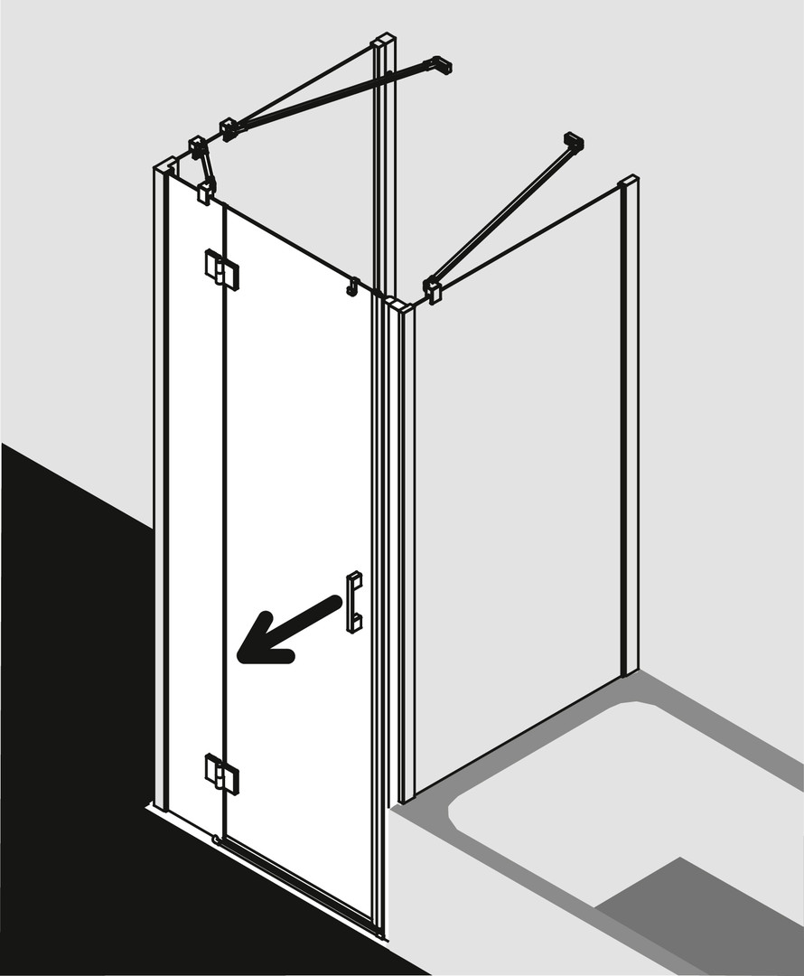 zum Einbau in einer Nische und zur Kombination mit LI TWD Seitenwand/LI TVD Seitenwand verkürzt auf Badewanne, teilgerahmte Tür mit einem Glasflügel, außen öffnend, mit einem Festfeld, mit Liga-Stabilisierung (innen), Ecke mit LI TWD/LI TVD mit zusätzlicher Liga-Stabilisierung (innen) ZDSS VSS LI, Verglasung mit 5 mm Einscheiben-Sicherheitsglas nach DIN EN 12150, Profile aus eloxiertem Aluminium, Griffe und Gelenke aus Metall, Verstellmöglichkeit je Wandprofil 25 mm, Beschlagsgelenk mit Hebe-Senk-Mechanismus, durchgehende Magnetleisten und Dichtprofile, waagerechte Dichtleiste mit Wasserabpralleffekt, mit Bodenschwelle (Höhe 6 mm) oder ohne Bodenschwelle (bodenfrei) installierbar, Befestigungsmaterial, transparenter Handtuchhalter-Haken, geprüft nach DIN EN 14428 (CE) und PPP 53005 (TÜV/GS)