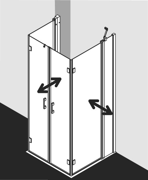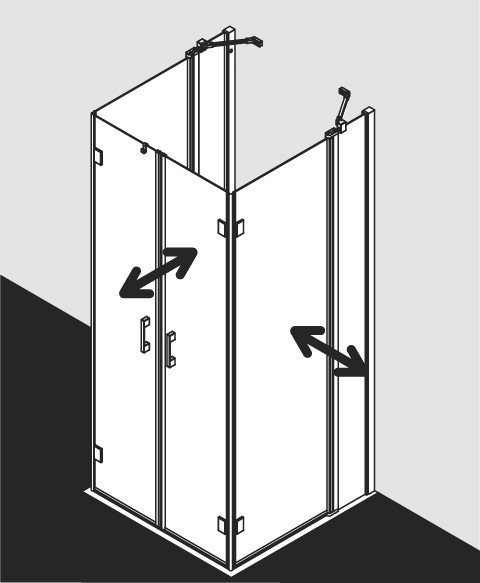 teilgerahmte U-Form-Duschkabine mit zwei Festfeldern und 2 Pendel-Falt-Flügel, im Gelenkprofil 90° nach innen und außen schwenkbar, im Beschlaggelenk 90°nach innen und außen schwenkbar, mit zwei LIGA-Stabilisierungen (innen), Verglasung mit 5 mm Einscheiben-Sicherheitsglas nach DIN EN 12150, Profile aus eloxiertem Aluminium, Griffe und Gelenke aus Metall, bei Oberfläche silber mattglanz und EXTRA, Griffe, Gelenke und Anschlüsse für Bodenschwelle in Chrom, Verstellmöglichkeit im Wandprofil 25 mm, Profilgelenk mit Hebe-Senk-Mechanismus, Beschlaggelenk mit Hebe-Senk-Mechanismus, durchgehende Magnetleisten und Dichtprofile, waagerechte Dichtleiste mit Wasserabpralleffekt, mit Bodenschwelle (Höhe 6 mm), oder ohne Bodenschwelle (bodenfrei) installierbar, konstruktionsbedingt ist bei LIGA keine absolute Abdichtung erreichbar, mit Befestigungsmaterial und einem transparenten Handtuchhalter-Haken, geprüft nach DIN EN 14428 (CE) und PPP 53005 (TÜV/GS)