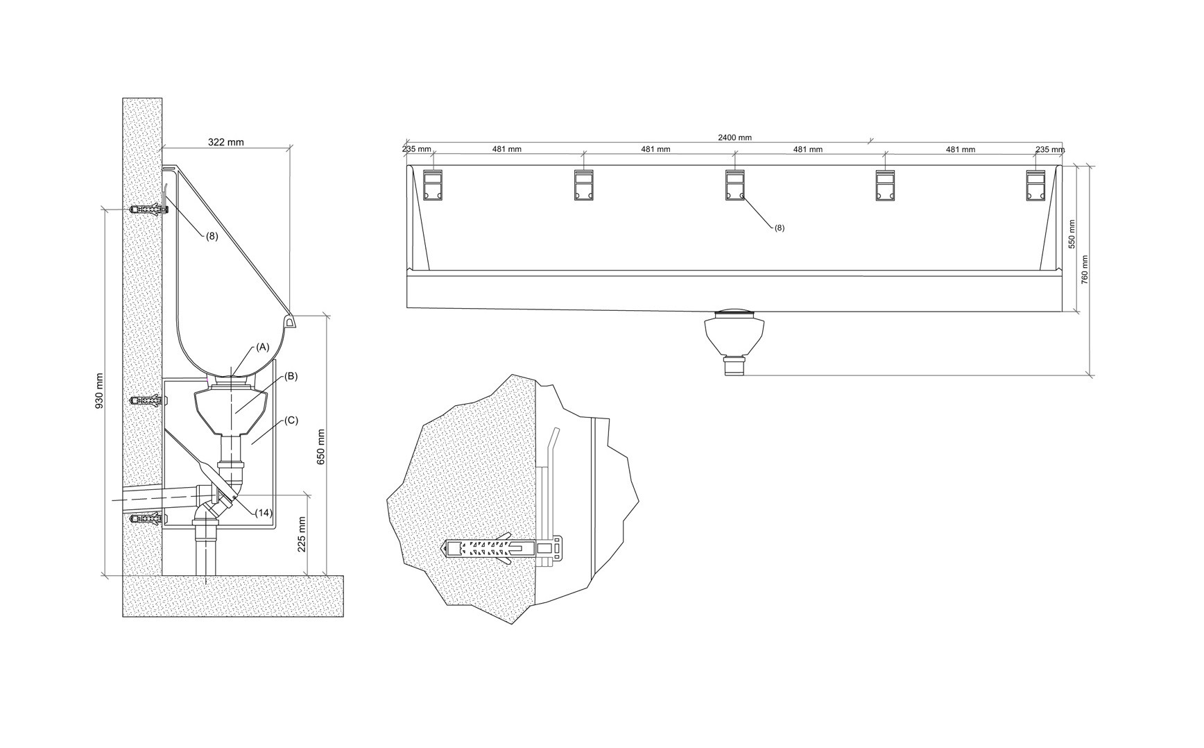 Sanit Urinal Crew 240 cm, Glasfiber, Anschluss horizontal oder vertikal, grau