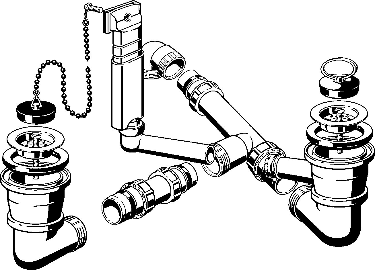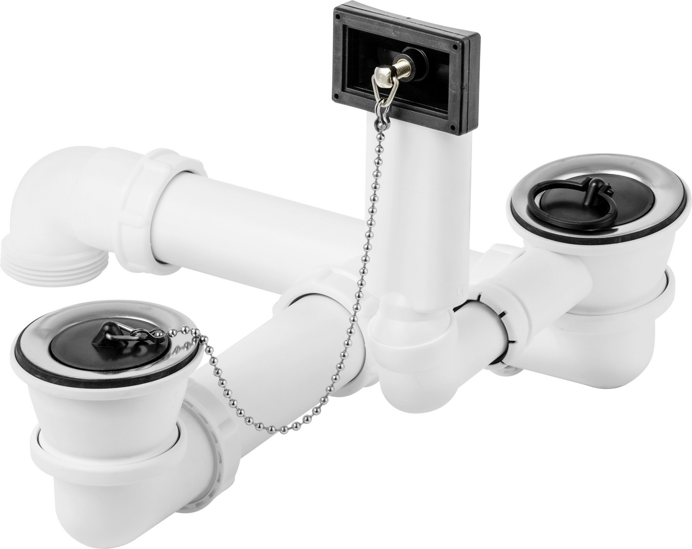 für reversible Doppelspülen, mit 90°-Ablaufbogen, mit Ventiloberteil aus Edelstahl, Überlaufdichtung (für gerade und gebogene Spülenwände), mit höhenverstellbarem Überlaufrohr mit Kugelgelenk, mit Stopfen mit Schlüsselring, Ventilstopfen mit Kettenhalter und verchromter Kugelkette 250 mm