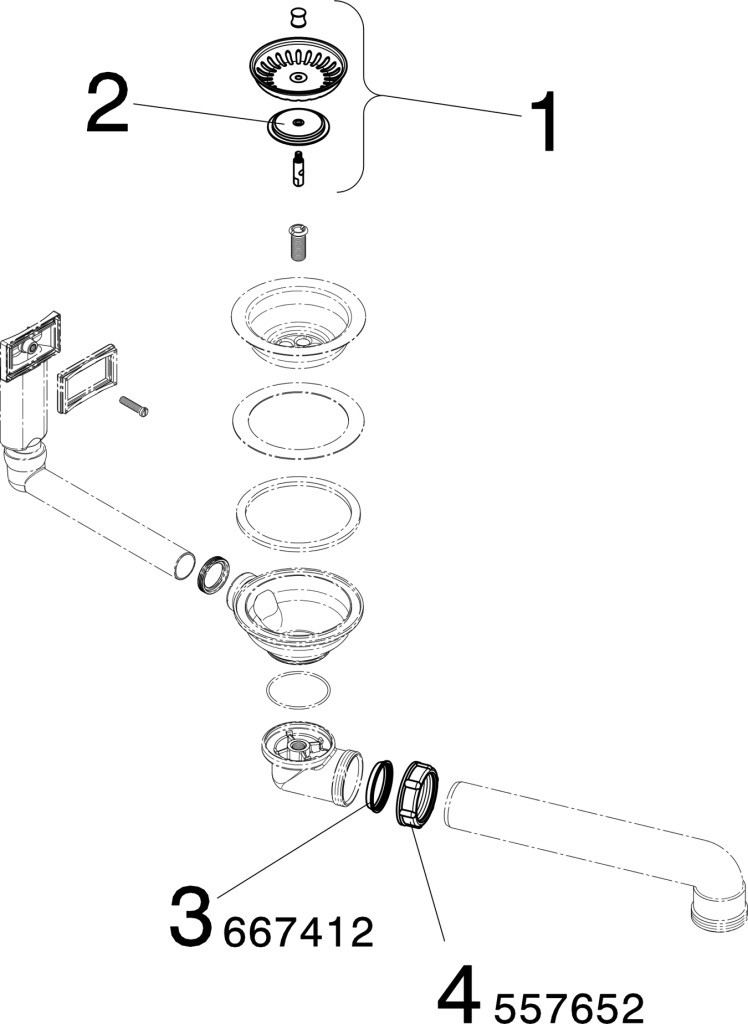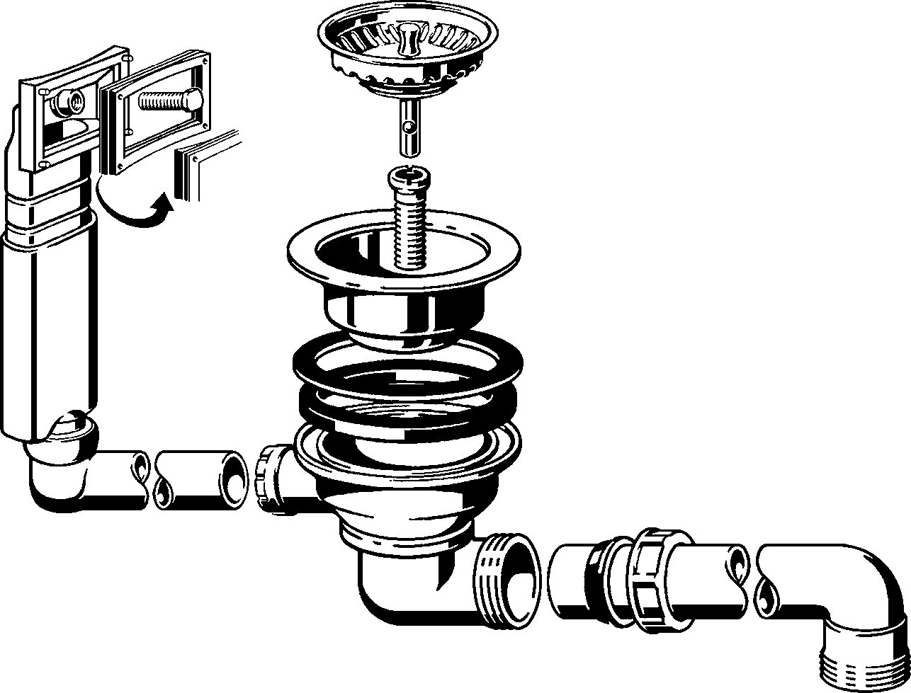 für Spüle mit Ablaufloch Ø 90 mm, Überlauf, Überlaufdichtung (geeignet für gerade und gebogene Spülenwände), Körbchen Edelstahl herausnehmbar, Ablaufbogen 90°, Ventiloberteil Edelstahl