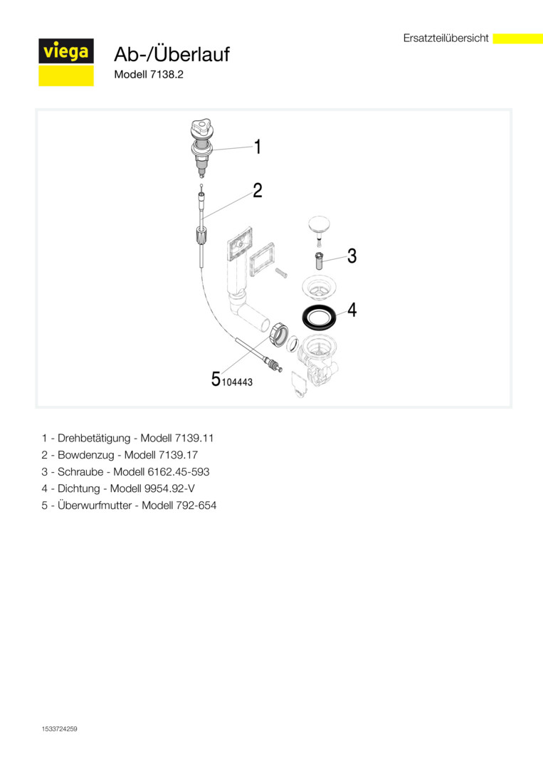 Viega Ablaufgarnitur 7138.2 G 1 1/2 x 70 mm, Kunststoff weiß, mit Bowdenzug/Überlauf