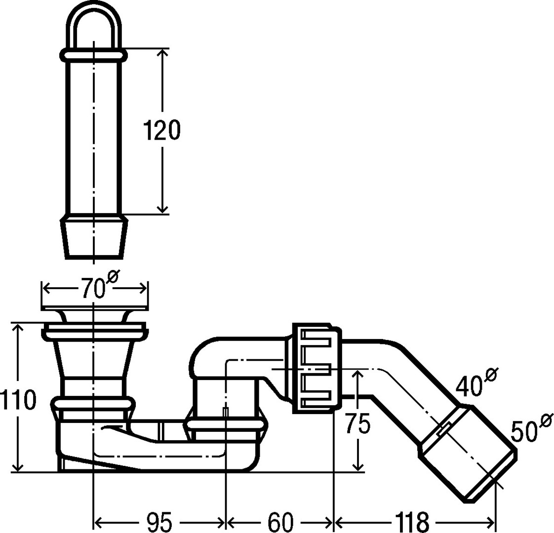 Ablaufbogen 45°, mit Geruchsverschluss und Standrohr, Sperrwasserhöhe 50 mm, Ablaufleistung Anstauhöhe 120 mm 0,53 l/s, güteüberwacht nach DIN EN 274