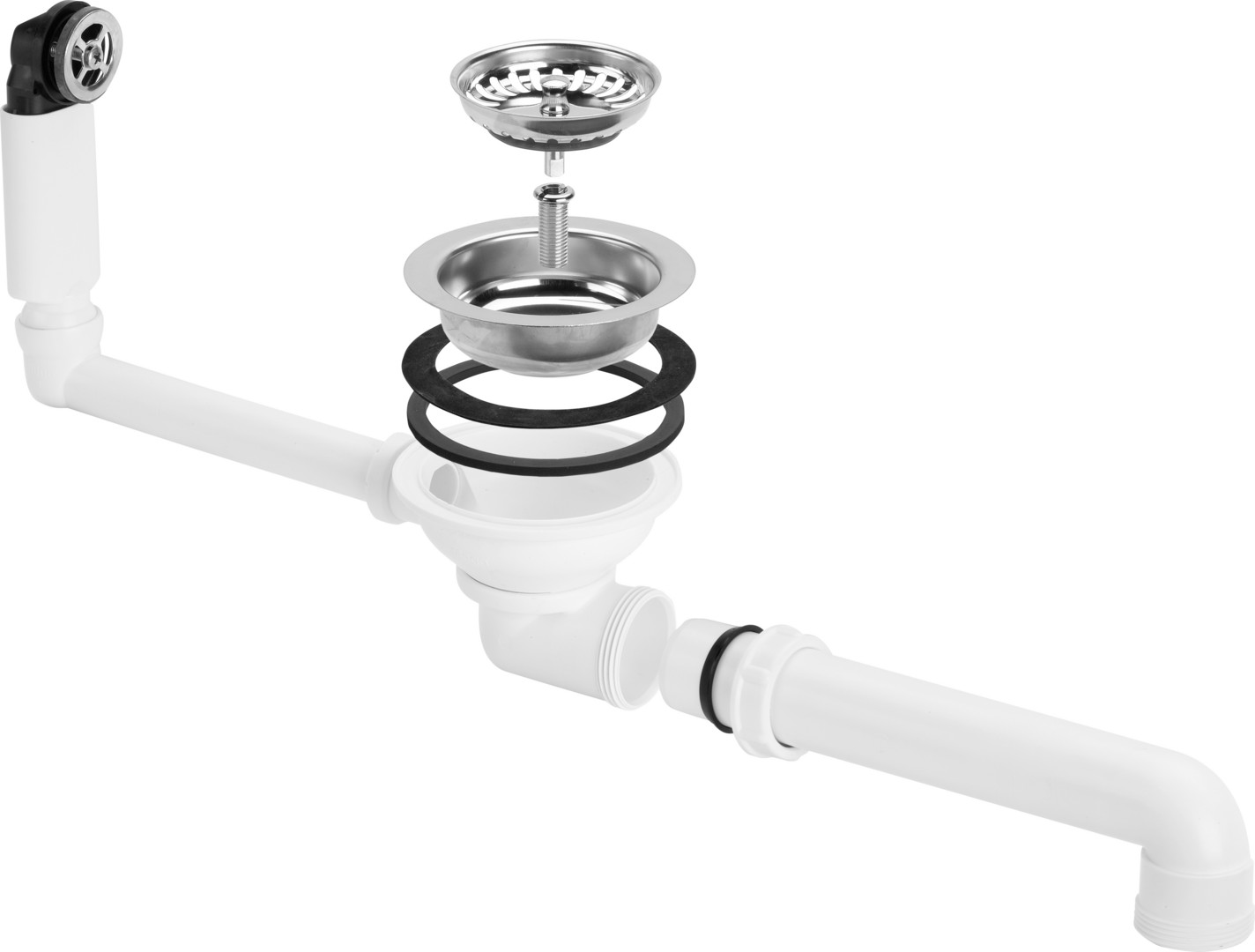 für Spüle mit Ablaufloch Ø 90 mm, Überlaufsieb, Körbchen Edelstahl herausnehmbar, Ablaufbogen 90°, Ventiloberteil Edelstahl