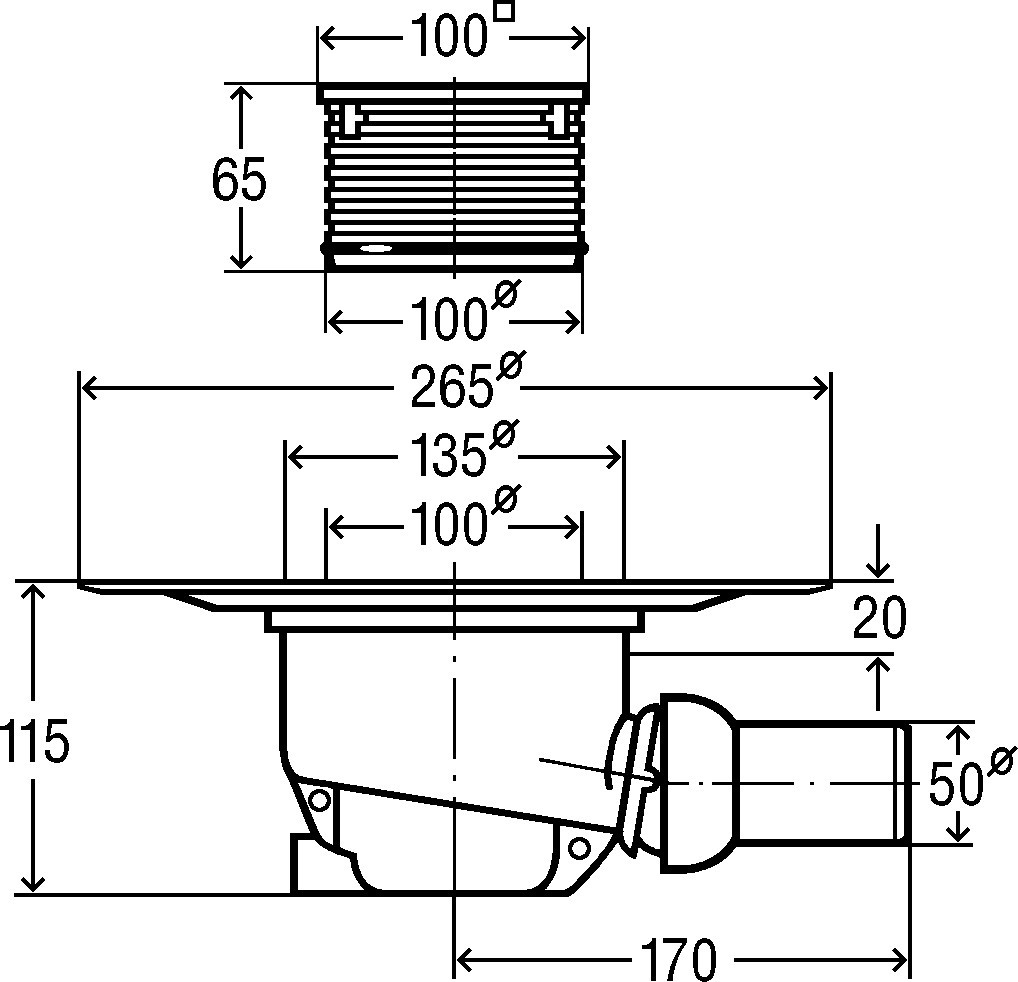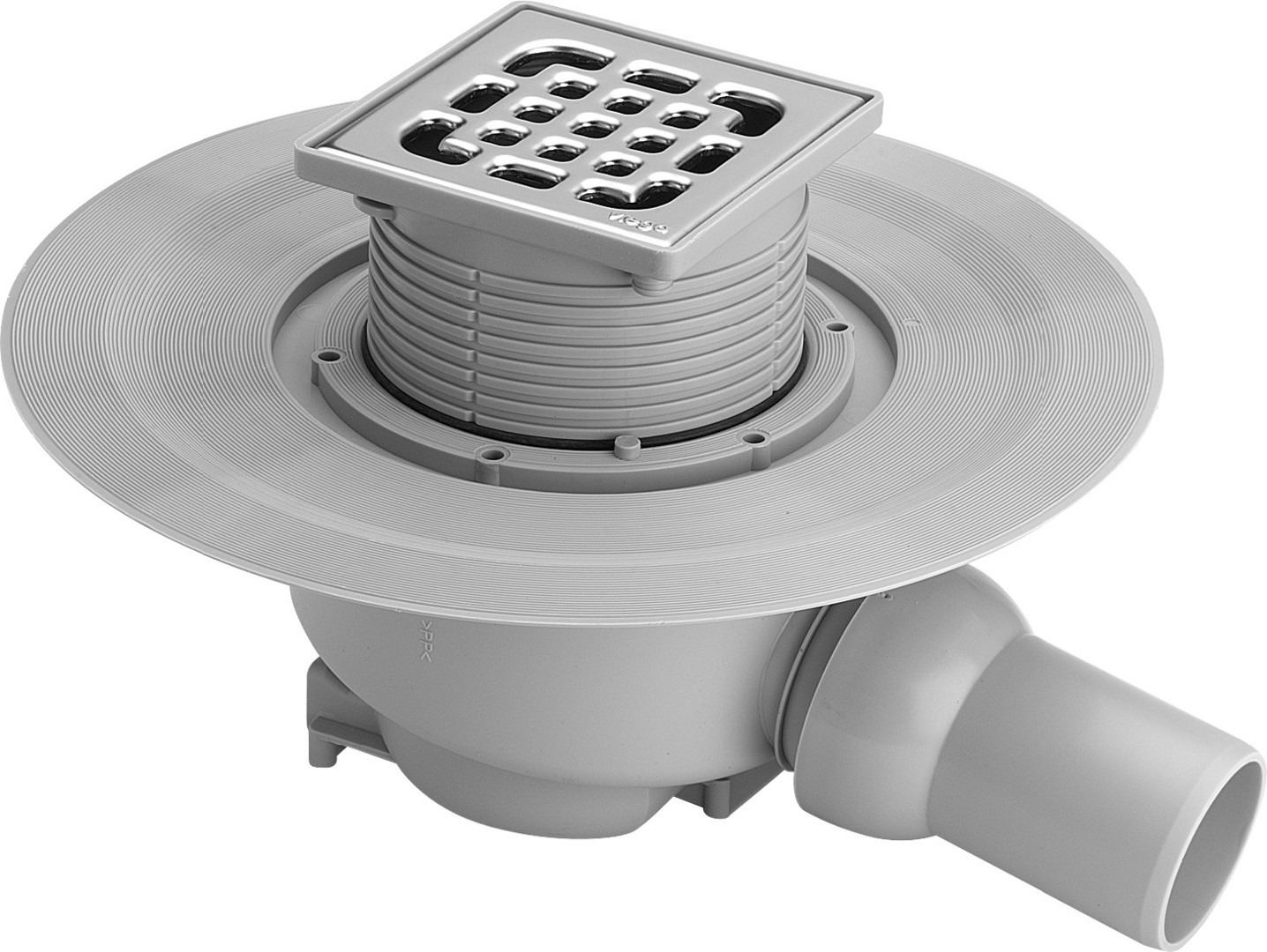 Systemmaß 100, bestehend aus Aufsatz 100 x 100 mm dreh- und höhenverstellbar, Rahmen Kunststoff, Rost Edelstahl 1.4301, Stopfen, Abdichtungsflansch, Geruchverschluss herausnehmbar, Ablaufrohr mit Kugelgelenk, Belastungsklasse K=300 kg, Ablaufleistung Anstauhöhe 10 mm 0,6 l/s, Ablaufleistung Anstauhöhe 20 mm 0,9 l/s, güteüberwacht nach DIN EN 1253