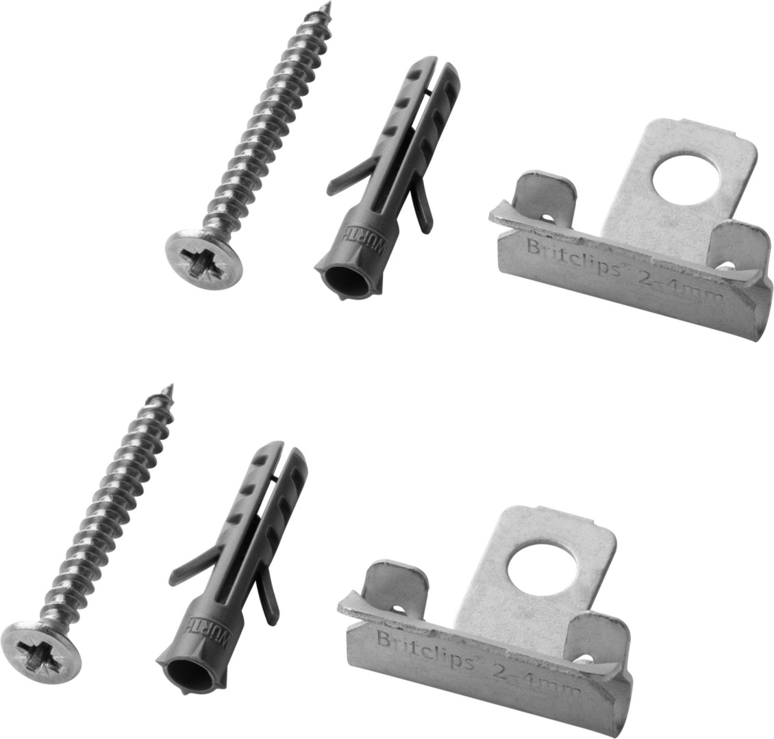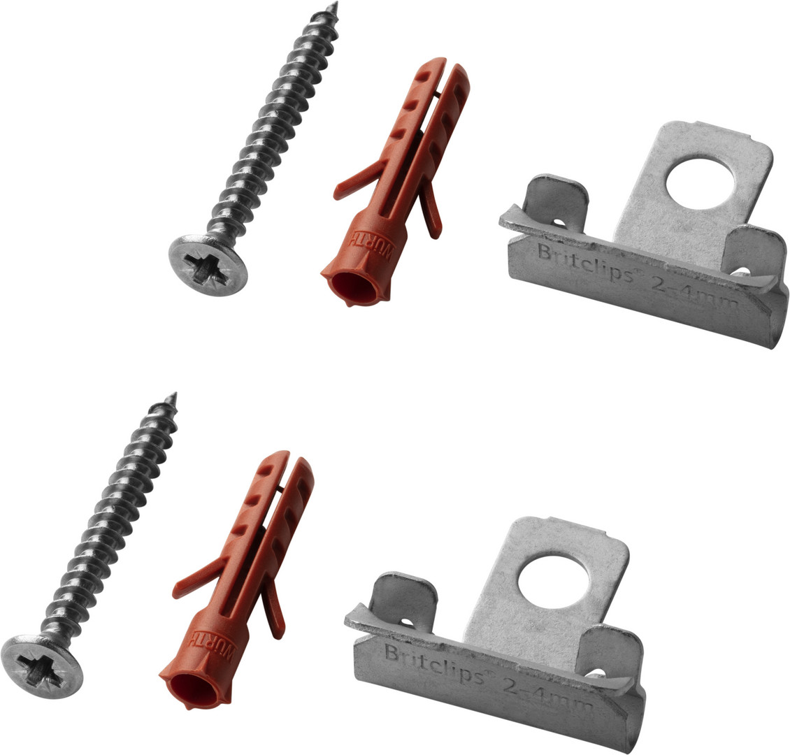 mit Halteklammern, Befestigungsschrauben und Kunststoffdübeln