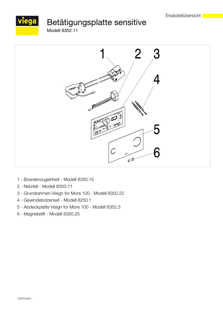 für UP-Spülkasten 2H, UP-Spülkasten 2L, UP-Spülkasten 2C, optional zusätzlich bestellbar Adapter Modell 8355.91, Glas, berührungslose Auslösung von vorn oder oben, 2-Mengen-Spültechnik, mit Viega Hygiene+ Funktion, Bowdenzugeinheit, Netzteil (Kabellänge 1,05 m), Befestigungsrahmen, Befestigungsmaterial, Werkseinstellung Teilspülmenge ca. 3 l, Werkseinstellung Vollspülmenge ca. 6 l, Netzspannung 100-240 V/50-60 Hz.