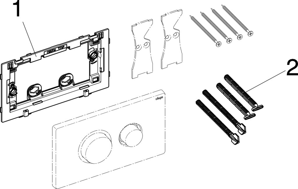 mit Befestigungsrahmen, Betätigungsstifteset und Befestigungsbolzen, für alle Prevista-UP-Spülkästen, manuelle Spülauslösung von vorn oder oben, 2-Mengen-Spültechnik, vandalensicher, verschraubbar