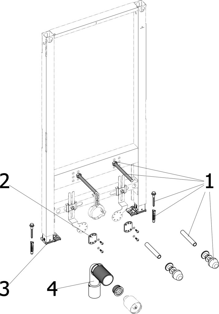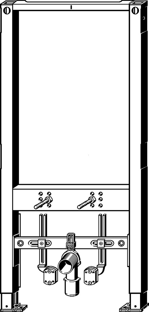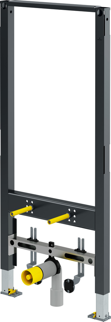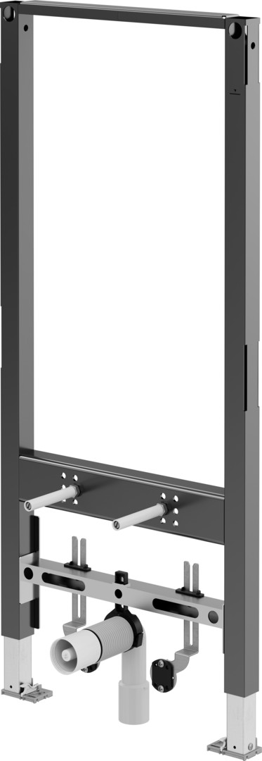 Rahmen pulverbeschichtet (40x40), Befestigung höhenverstellbar, Ablaufbogen DN 40/50 kürzbar, Gumminippel DN 50/30, Befestigungsmaterial, Fußbremse zum Einstellen der Bauhöhe