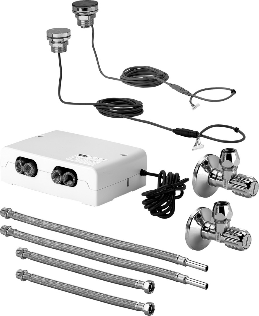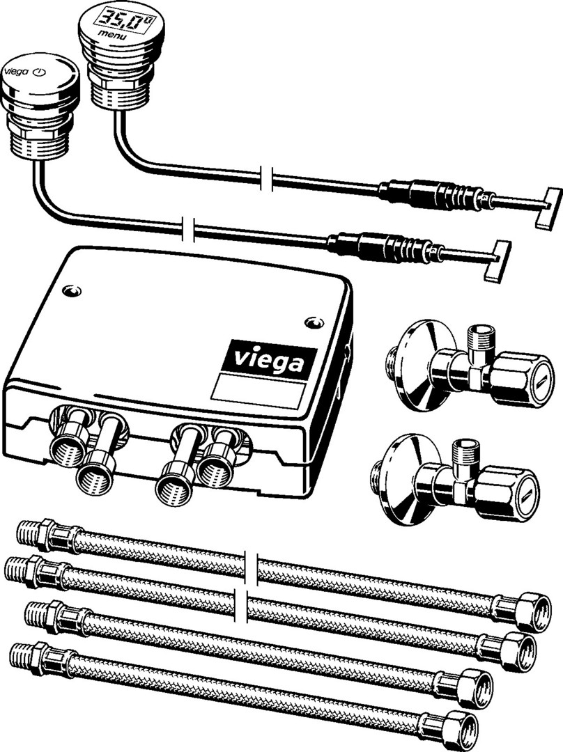 für Befüllung einer Badewanne (elektronisch gesteuert), in Verbindung mit Multiplex Trio, Multiplex Trio F, Rotaplex Trio oder Rotaplex Trio F (optional elektrisch betrieben), optional zusätzlich bestellbar Multiplex Trio E-WLAN-Modul Modell6146.224, elektrisches Öffnen/Schließen einer Viega Ablaufgarnitur, fernbedienbar durch mobile Endgeräte (Android, iOS, Windows) im Direktbetrieb oder Internet mit Multiplex Trio E-WLAN-Modul, bestehend aus Bedienelement verchromt (Ein/Aus, Temperaturverstellung), Displayelement verchromt mit Glasoberfläche zur Temperaturanzeige und Drückfunktion für Menüwahl, Speicherfunktion für Temperatur und Wasserzulaufmenge sowie Füllhöhe, 3 personalisierbare Voreinstellungen, Wanneneinlauf- Handbrausenfunktion manuell umschaltbar, 40 °C-Sperre manuell überbrückbar, Anschlussschläuche flexibel, Eckventile, Netzteil, Netzspannung 100-240 V/50-60 Hz, nach DIN EN 1111