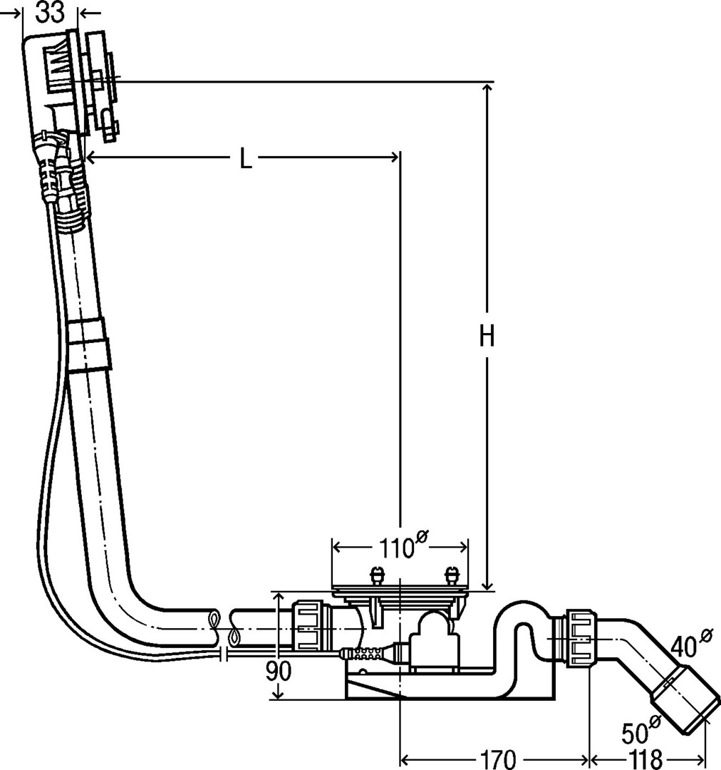 Wannen-Ab/-Überlaufgarnitur, flache Ausführung, nur 33 mm Platzbedarf hinter Badewanne, für Wasserzulauf durch Überlaufkörper, ohne Drehrosette, Abdeckhaube, Überlaufrosette, bestehend aus Zulaufflansch, Geruchsverschluss, Ablaufbogen 45°, Sperrwasserhöhe 50 mm, Ablaufleistung Anstauhöhe 300 mm 1,25 l/s, Überlaufleistung Anstauhöhe 60 mm über Mitte Überlaufloch 0,63 l/s, güteüberwacht nach DIN EN 274