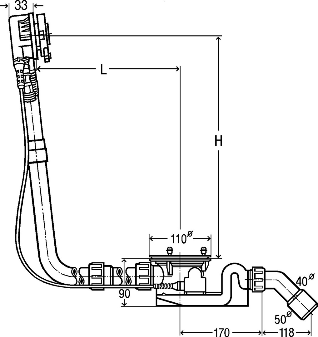 Wannen-Ab-/Überlaufgarnitur, flache Ausführung, nur 33 mm Platzbedarf hinter Badewanne, für Wasserzulauf durch Überlaufkörper, ohne Drehrosette, Abdeckhaube, Überlaufrosette, bestehend aus Zulaufflansch, Geruchsverschluss, Ablaufbogen 45°, Sperrwasserhöhe 50 mm, Ablaufleistung Anstauhöhe 300 mm 1,25 l/s, Überlaufleistung Anstauhöhe 60 mm über Mitte Überlaufloch 0,63 l/s, güteüberwacht nach DIN EN 274