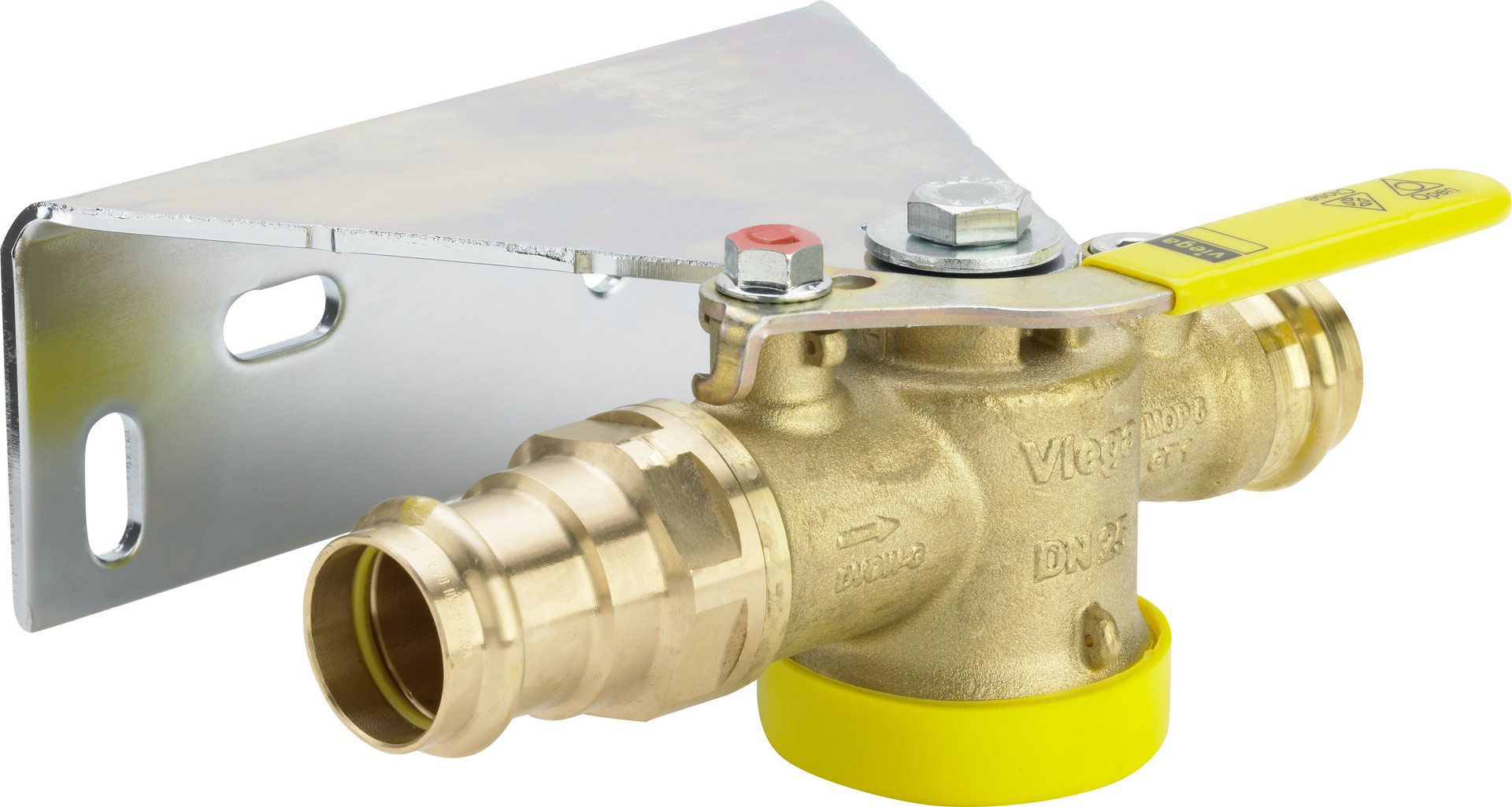 für Einstutzengaszähler, Eingang/Ausgang Profipress G-Anschluss (beidseitig angeformt), abschließbar, plombierbar, Durchgangsform, mit Prüföffnung < 1 mm, Wandhalterung/Befestigungsset, Prüfschraube G 1/8, Dichtelemente HNBR, Umgebungstemperatur max. 70 °C, HTB (höher thermisch belastbar), 650 °C/30 min GT1, Betriebsdruck max. 0,5 MPa (MOP 5), mit DIN-DVGW-G-Prüfzeichen