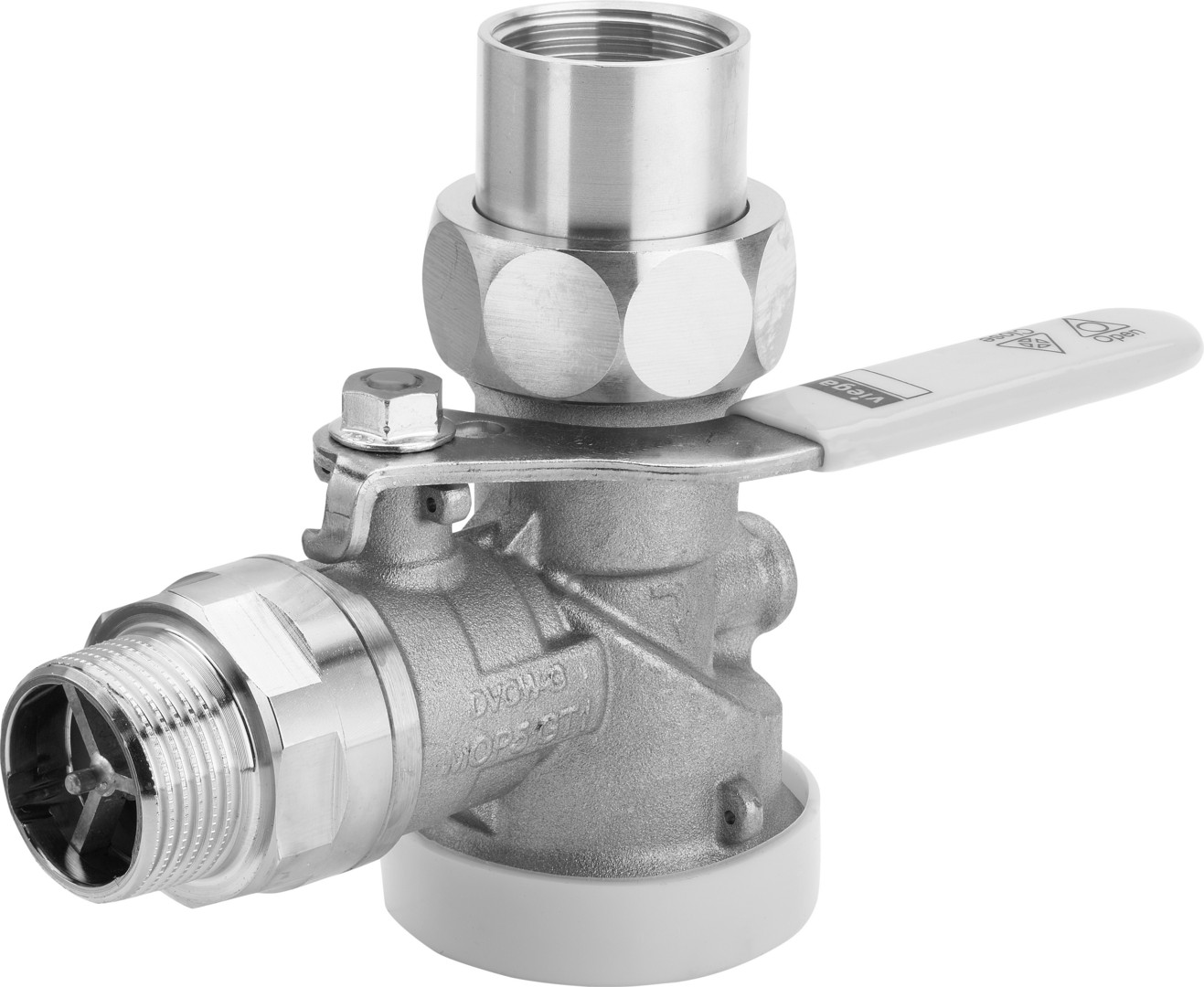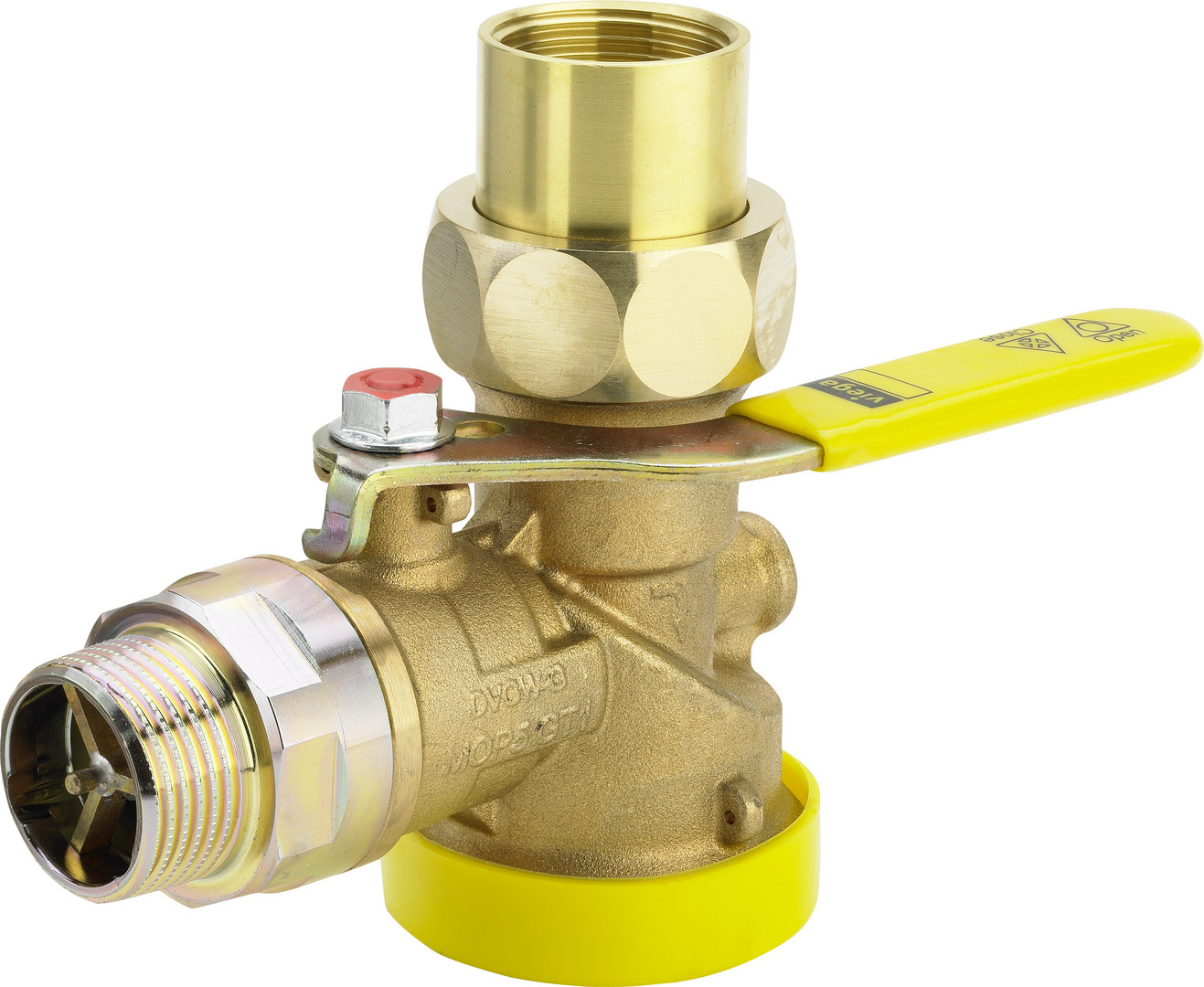 für Einstutzengaszähler, Eingang R-Gewinde, Ausgang Verschraubung mit Rp-Gewinde, abschließbar, plombierbar, Eckform, mit Prüföffnung < 1 mm, Prüfschraube G 1/8, Umgebungstemperatur max. 70 °C, Betriebsdruck max. 0,5 MPa (MOP 5), höher thermisch belastbar, 650 °C/30 min GT1, mit DIN-DVGW-Prüfzeichen