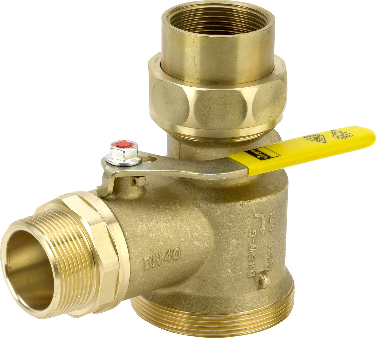 für Einstutzengaszähler G10 und G16, Eingang R-Gewinde, Ausgang Verschraubung mit Rp-Gewinde, abschließbar, plombierbar, mit Prüföffnung < 1 mm, Prüfschraube G 1/8, Umgebungstemperatur max. 70 °C, Betriebsdruck max. 0,5 MPa (MOP 5), höher thermisch belastbar, 650 °C/30 min GT1, mit DIN-DVGW-Prüfzeichen