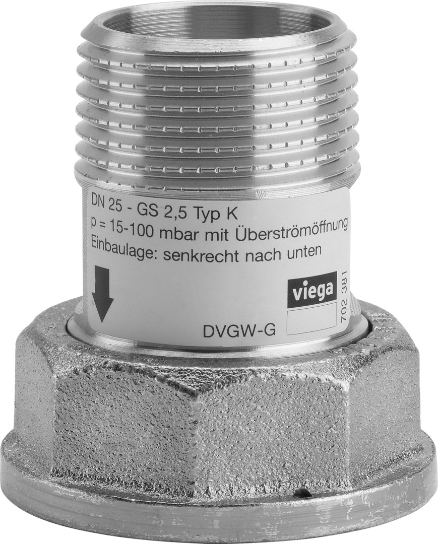 Einbauart vertikal nach unten, für Nachrüstung von GS in bestehende Anlage mit Zweistutzengaszähler, Absperrung des Gasflusses wenn der Gasvolumenstrom einen vorgegebenen Wert infolge nichtbestimmungsgemäßen Gasaustrittes überschreitet, Messing, Eingang R-Gewinde, Ausgang G-Gewinde, mit Anschlussverschraubung, HTB (höher thermisch belastbar) 650 °C/30 min Betriebsdruck 15-100 mbar mit DVGW-G-Prüfzeichen