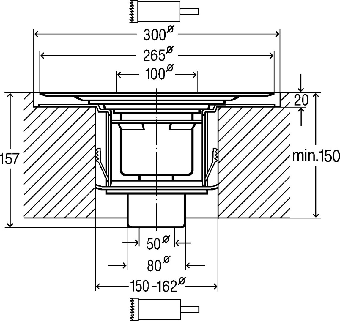 Ablauf senkrecht, für Einbau in Decke mit Feuerwiderstandsklasse F30-F120 mit Dicke von mind. 150 mm, PP, Systemmaß 100, bestehend aus Stopfen, Abdichtungsflansch, Geruchsverschluss herausnehmbar, Ablaufleistung Anstauhöhe 10 mm 0,7 l/s, Ablaufleistung Anstauhöhe 20 mm 0,9 l/s, güteüberwacht nach DIN EN 1253, mit allgemeiner Bauaufsichtlicher Zulassung (ABZ), DIBt-Zulassung Z-19. 17-1770