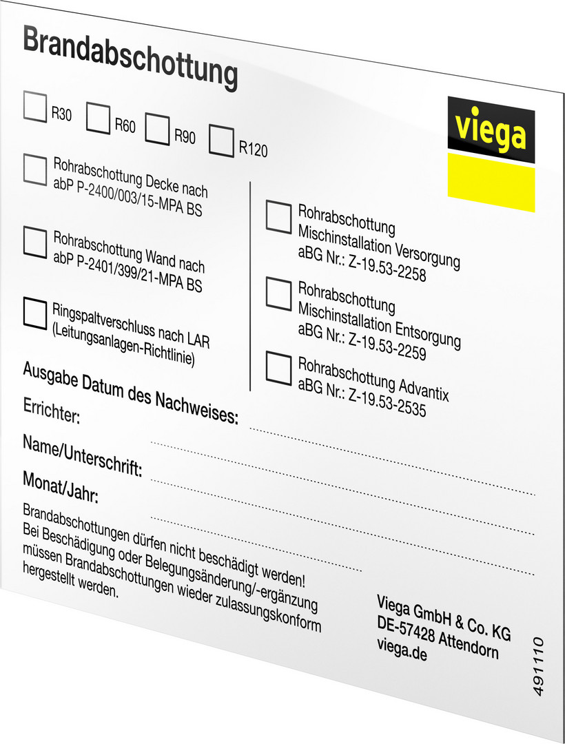 für dauerhafte Kennzeichnung von klassifizierten Viega Rohrabschottungen durch Decken und Wände sowie zur Dokumentation einer Durchführung nach Leitungsanlagenrichtlinie, optional zusätzlich bestellbar Markierungsstift Modell 2490.1, Kunststoff, Ausstattung: Anwendbarkeitsnachweise