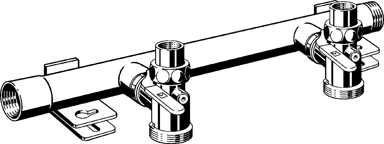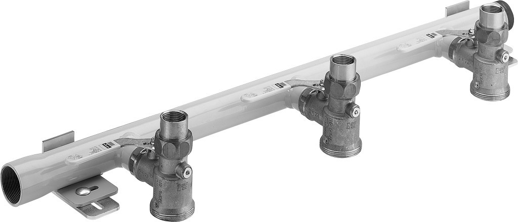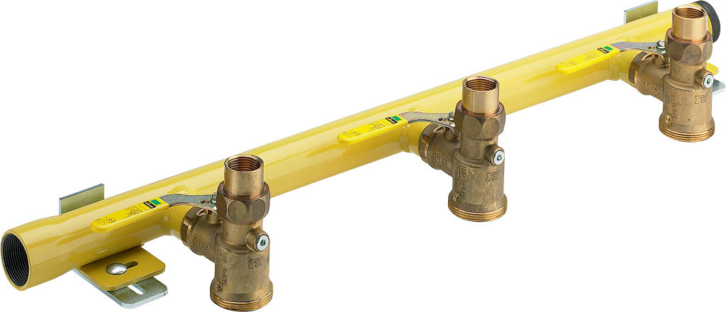 für Reihenmontage von 2 oder 3 Einstutzengaszählern, Stahlrohr DN40 geschweißt, gelb pulverbeschichtet, Rp-Gewinde links, R-Gewinde rechts, bestehend aus Gaszählerkugeleckhähne Messing eingedichtet, Ausgangsverschraubung Rp1, Wandhalterung, Umgebungstemperatur max. 70 °C, HTB (höher thermisch belastbar), 650 °C/30 min GT1, Betriebsdruck max. 0,5 MPa (MOP 5), mit DIN-DVGW-G-Prüfzeichen