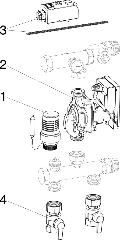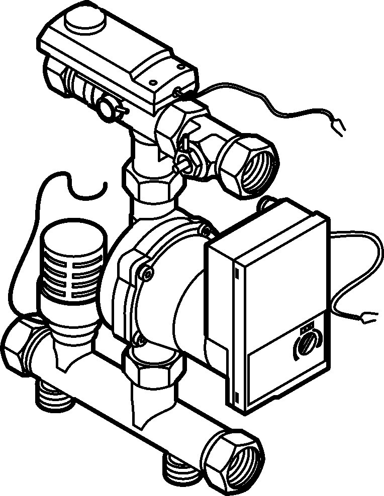 für Fonterra-Flächentemperierung, Regelung der Vorlauftemperatur (konstant), ausgestattet mit Fonterra-Thermostatkopf Modell 1254.1, Messing, Hocheffizienzpumpe Wilo Yonos PARA RS 15/6 RKA, Sicherheitsanlegethermostat, Thermometer, Kugelhahnset, Doppelnippelset, Betriebstemperatur max. 80 °C, Betriebsdruck 0,6 bar, Heizleistung max. 14 kW