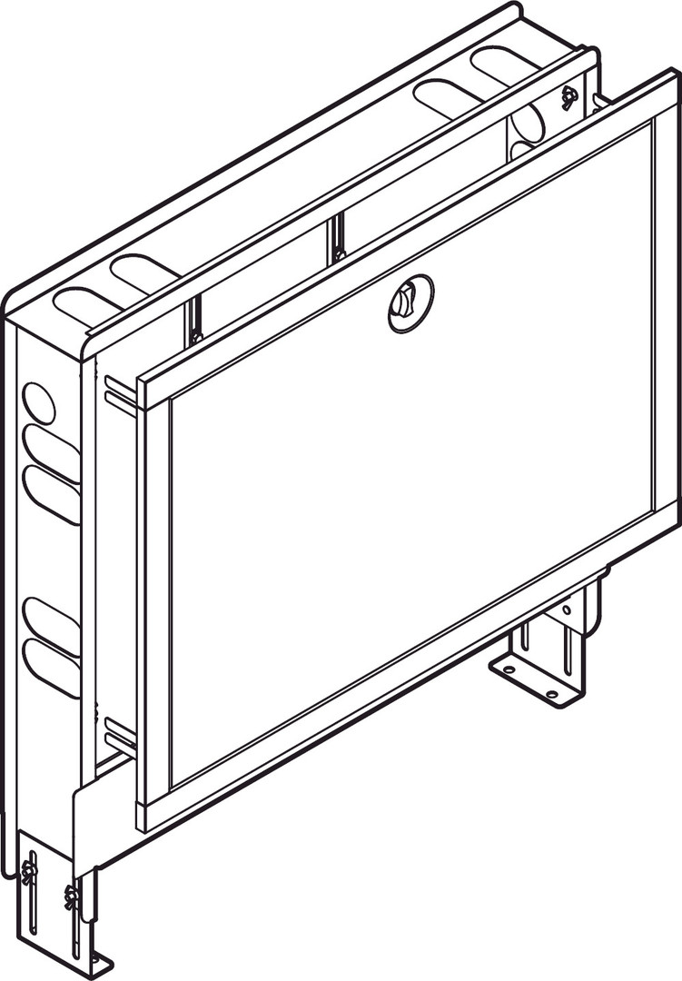 für Flächentemperierung, geeignet für Fonterra-Heizkreisverteiler DN 25 Modell 1010, Stahlblech feuerverzinkt/weiß=RAL 9010, höhenverstellbar von 675–855 mm, Rahmenhöhe 547 mm, Rahmen und Tür, Abschlussblende abnehmbar für sichere Rohrführung im Anschlussbereich, Wandhalterung, Universalhalterung für Fonterra-Heizkreisverteiler Modell 1005 integriert, zur Montage der Fonterra-Heizkreisverteiler Modelle 1004 und 1006 ist das Fonterra-Wandhalterungsset Modell 1299.1 zu verwenden