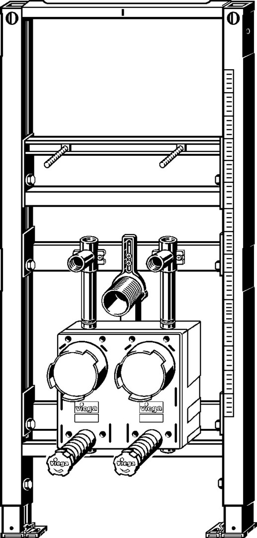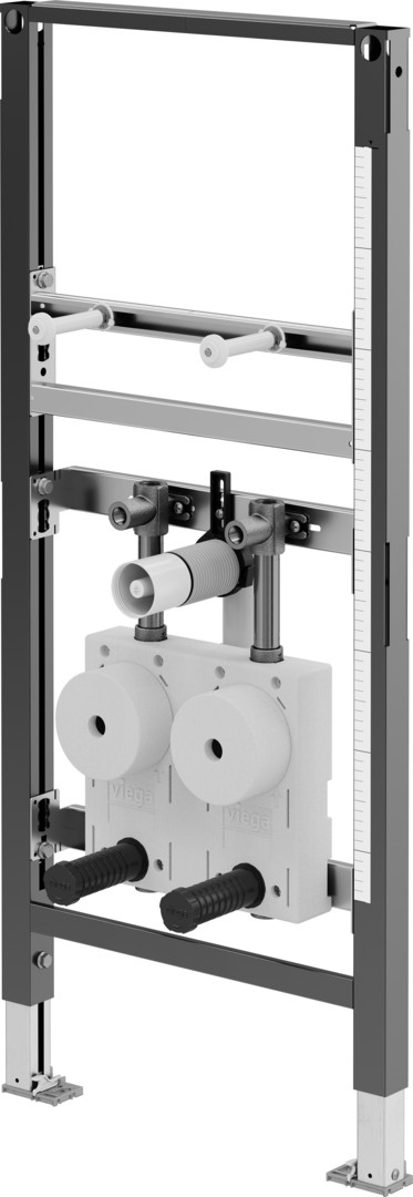 Rahmen pulverbeschichtet (40 x 40), UP-Wasser Zählergehäuse EAS Typ ISTA mit G2KOAX-Gewinde zum Einbau von Wasserzählermesskapsel ISTA Typ istameter QN 1,5 cbm/h und QN 2,5 cbm/h, 2 Wasserstrecken vormontiert mit Geradsitzventile 3/4, Wasserzählergehäuse mit G2KOAX-Gewinde in Dämmbox, jeweils ein-/ausgangsseitig (für Etagenverteilung) mit Rp 3/4, Anschluss Rp 1/2 für WT-Armatur, 2 Schutzkappen und Abdrücksets, Keramikhöhe und Zählereinheit verstellbar (Träger mit Maßband zur Ausrichtung), Ablaufbogen kürzbar DN 40/50 mit Gumminippel DN 50/30, Befestigungsmaterial für Element (für Boden) und Keramik, Schrauben (selbstbohrend) für Befestigung an Metallständerwerk, Loch- Ø 11 mm für Befestigung im Holzständerbau, Fußbremse zum Einstellen der Bauhöhe