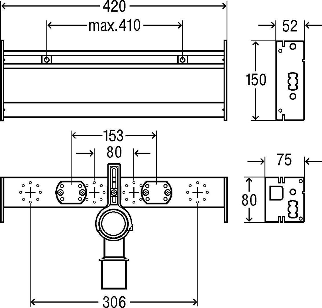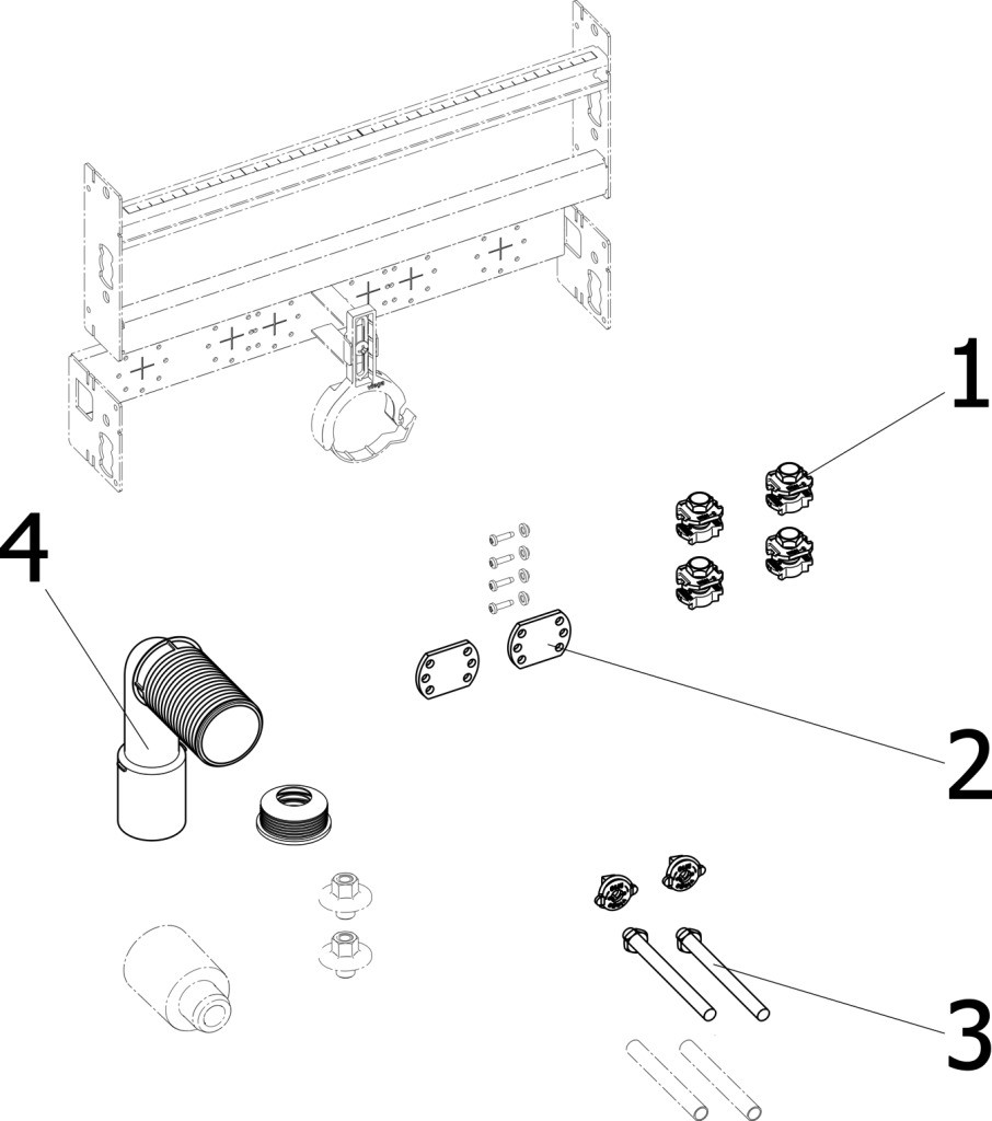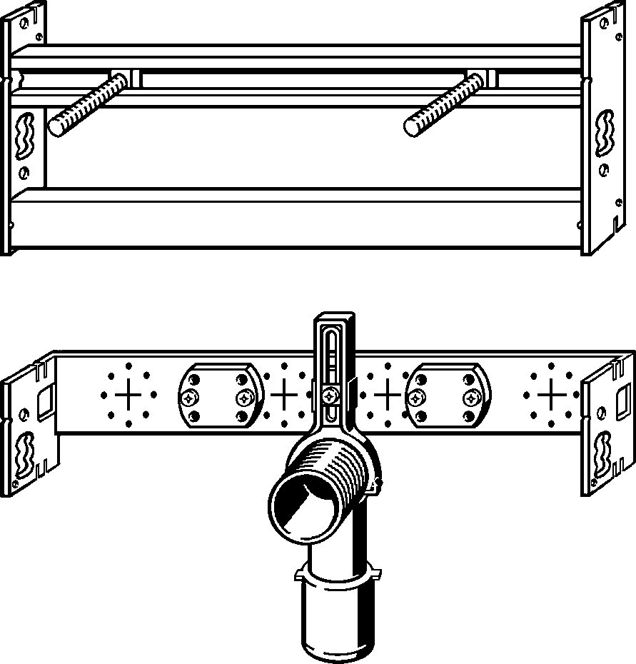Stahl, Befestigung höhenverstellbar und schallgeschützt für Wandscheiben, Befestigungsmaterial für Modul und Keramik, Ablaufbogen kürzbar DN 40/50 mit Gumminippel DN 50/30