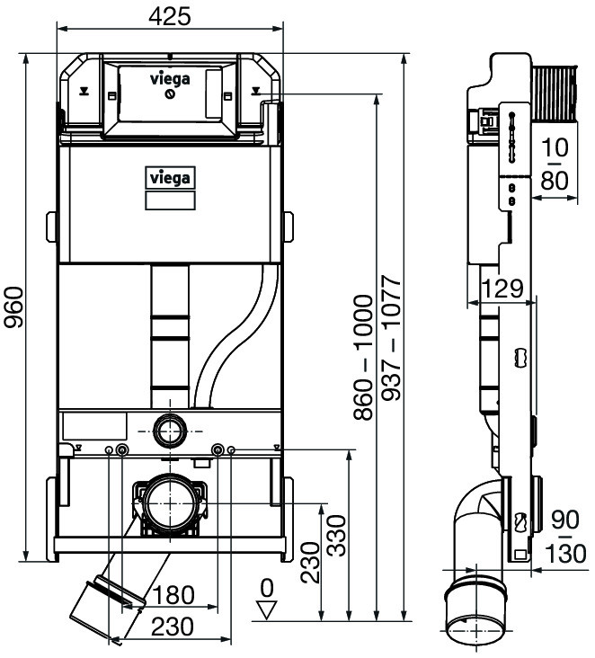 Viega Wand-WC-Element Prevista Dry Plus-8515 937 - 1077 mm, höhenverstellbar