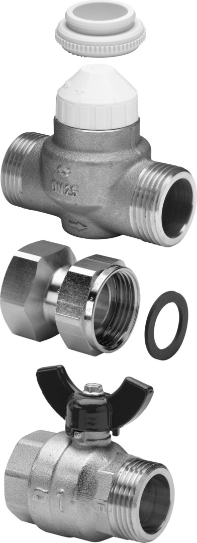 für Flächentemperierung und Fonterra-Heizkreisverteiler DN 25, Fonterra-Stellantrieb Modell 1249, 1249.1, Zonenventil mit Bauschutzkappe, Kugelhahn für Vorlaufleitung, Distanzstück DN 25, Dichtungen