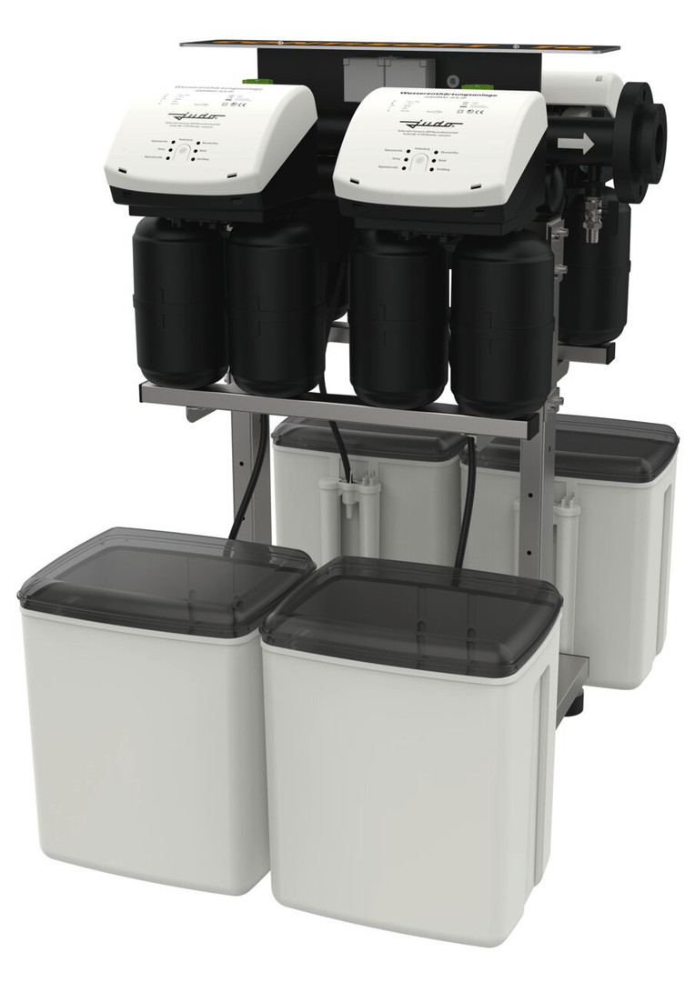 schützt mit weichem Wasser vor Kalkablagerungen und erhöht den Komfort, stagnationsfreie Betriebsabläufe, die parallele Betriebsweise garantiert die gleichmäßige Durchströmung aller Anlagenteile, mit DIN-DVGW-geprüften Einzelmodulen, für Trinkwasser bis 30 °C, Betriebsdruck 2-7 bar, Anlage bestehend aus einem Gestell mit angebautem Wasserverteiler (JCS 5 mit Anschlussblock JQP) und getrennt abstellbaren Enthärteranschlüssen zur Aufnahme der Einzelmodule (JCS 5 mit einem gemeinsamen Umgehungsventil), die Austauscherbehälter (PN 10) der Einzelmodule sind gefüllt mit Ionenaustauscherharz in Lebensmittelqualität zur optimalen Wasserverteilung und Minimierung von Druckverlust und Regeneriermittelaufwand, mit mengenabhängiger Steuerung, verschleißfreie Keramikscheiben-Technologie für lebenslang programmierte Betriebsabläufe, Steuerungselektronik mit LED-Anzeige aller Betriebs- und Regenerationszustände, sowie manueller Auslösung der Regeneration, Zwangsregeneration nach spätestens 96 Stunden und Anlagenhygienisierung durch eingebaute Desinfektionseinrichtung mit platinierten Titanelektroden, separate Salzlöse- und Vorratsbehälter mit kontinuierlicher Solebevorratung, komplett mit interner Anlagenverrohrung und Resthärteverschneidung, Spannungsversorgung 230 V/50 Hz