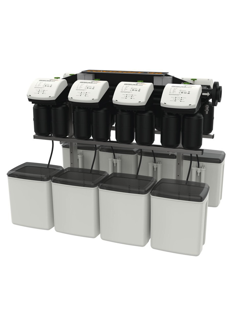 schützt mit weichem Wasser vor Kalkablagerungen und erhöht den Komfort, stagnationsfreie Betriebsabläufe, die parallele Betriebsweise garantiert die gleichmäßige Durchströmung aller Anlagenteile, mit DIN-DVGW-geprüften Einzelmodulen, für Trinkwasser bis 30 °C, Betriebsdruck 2-7 bar, Anlage bestehend aus einem Gestell mit angebautem Wasserverteiler (JCS 5 mit Anschlussblock JQP) und getrennt abstellbaren Enthärteranschlüssen zur Aufnahme der Einzelmodule (JCS 5 mit einem gemeinsamen Umgehungsventil), die Austauscherbehälter (PN 10) der Einzelmodule sind gefüllt mit Ionenaustauscherharz in Lebensmittelqualität zur optimalen Wasserverteilung und Minimierung von Druckverlust und Regeneriermittelaufwand, mit mengenabhängiger Steuerung, verschleißfreie Keramikscheiben-Technologie für lebenslang programmierte Betriebsabläufe, Steuerungselektronik mit LED-Anzeige aller Betriebs- und Regenerationszustände, sowie manueller Auslösung der Regeneration, Zwangsregeneration nach spätestens 96 Stunden und Anlagenhygienisierung durch eingebaute Desinfektionseinrichtung mit platinierten Titanelektroden, separate Salzlöse- und Vorratsbehälter mit kontinuierlicher Solebevorratung, komplett mit interner Anlagenverrohrung und Resthärteverschneidung, Spannungsversorgung 230 V/50 Hz