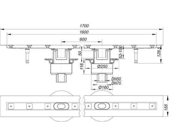 für die Montage in der Fläche, mit zwei seitenverstellbaren (+/- 15 mm) Ablaufgehäusen, Ablaufstutzen: DN 50/DN 70 senkrecht, schallentkoppelnde Montagefüße zur Höheneinstellung, besandeter Flansch zum sicheren Anschluss an Verbund- und Bahnenabdichtungen gem. DIN 18534, herausnehmbarer Geruchs- und Reinigungsverschluss, Sperrwasserhöhe 50 mm (gem. DIN EN 1253), höhenverstellbare Justierschrauben, Bauschutz, Fliesenanschlag, Rahmenklemmstück, Rinnenkörper: Edelstahl 1.4301, Ablaufkörper: Polypropylen, hochschlagfest, Brandschutz-Rohbauelement 1 (Art. Nr. 515018) einsetzbar