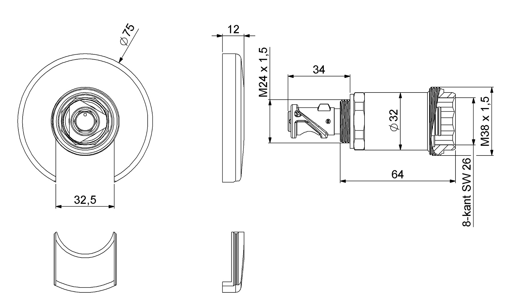 Anschlussarmatur für Rundstromventile DIN 3500, Hamburger Kolben Standardlänge, Einbautiefe max. 26,5 mm
