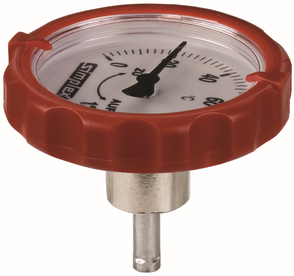 für Simplex Muffen- und Pumpen-Kugelhähne, integriertes Thermometer Ø 63 mm, metallischer Grundkörper mit Kunststoff-Griffelement, Firmenaufdruck auf Anfrage