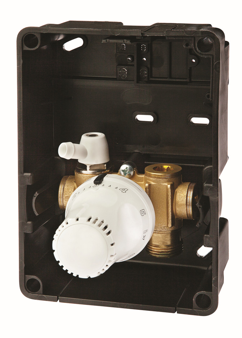 Grundausstattung: Wandeinbaukasten mit vormontiertem Ventilblock mit Entlüftung, Ventilblock-Anschluss mit 3/4 M Eurokonus für rohrseitigen Anschluss mittels Klemmverschraubung, außenliegender Thermostatkopf, Füll- und Entleerventil, Bauschutzkappe aus EPS, Wandabdeckung aus Kunststoff weiß (ähnlich RAL 9016), Befestigungslaschen für Tiefenverstellung der Wanddose, vorbereitet für die flexible Installation in Ständerwände (Installations-Set F11863), für raumtemperaturabhängige Regelung von Flächenheizungen, Bauteile aus Messing und Kunststoff, Dichtelement aus EPDM, max. Betriebstemperatur: primär 80 °C Dauertemperatur/95 °C kurzzeitig (die max. zulässige VL-Temp. der Flächenheizung ist zu beachten), max. Betriebsdruck 6 bar, bei Ausführung Exclusiv zusätzlich Topmeter zur Durchflussanzeige/-regulierung